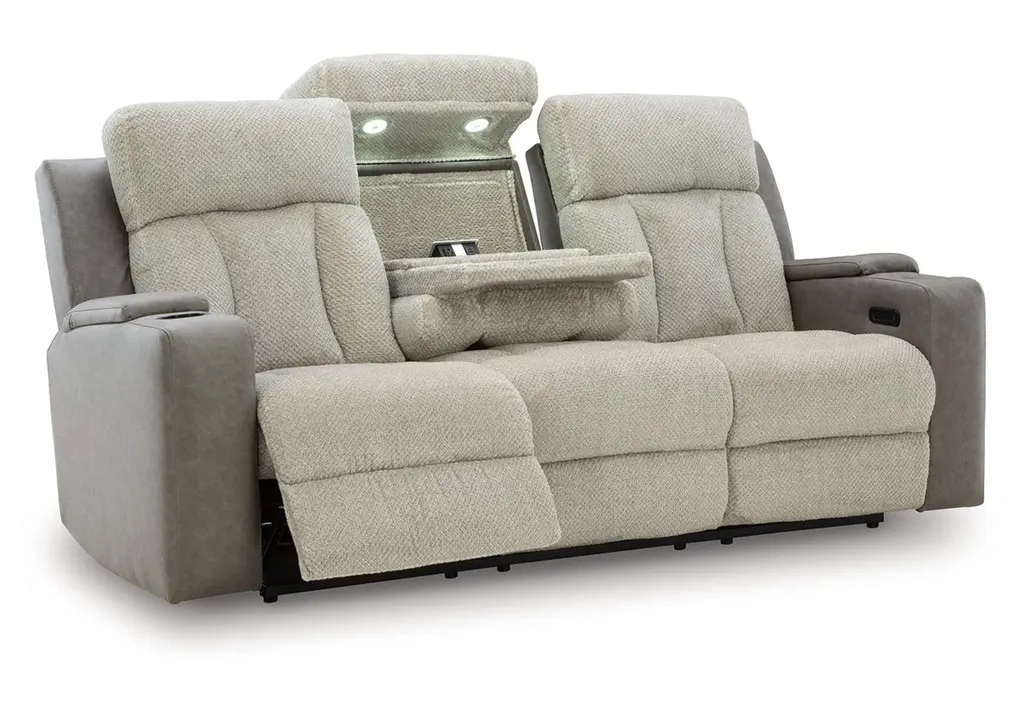 Refined relaxation, reimagined for the modern home. This power reclining sofa combines premium comfort with smart features like built-in storage arms, wireless charging and a drop-down table. One-touch reclining and adjustable headrests let you find your perfect position, while luxurious heat and massage functions melt away the day's stress. And for an added dose of style, it's wrapped in a two-tone upholstery that pairs soft textured fabric with coordinating faux leather. Weight 293.000 lbs. (131.85kgs.)