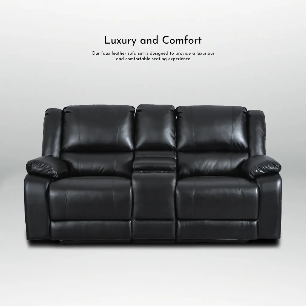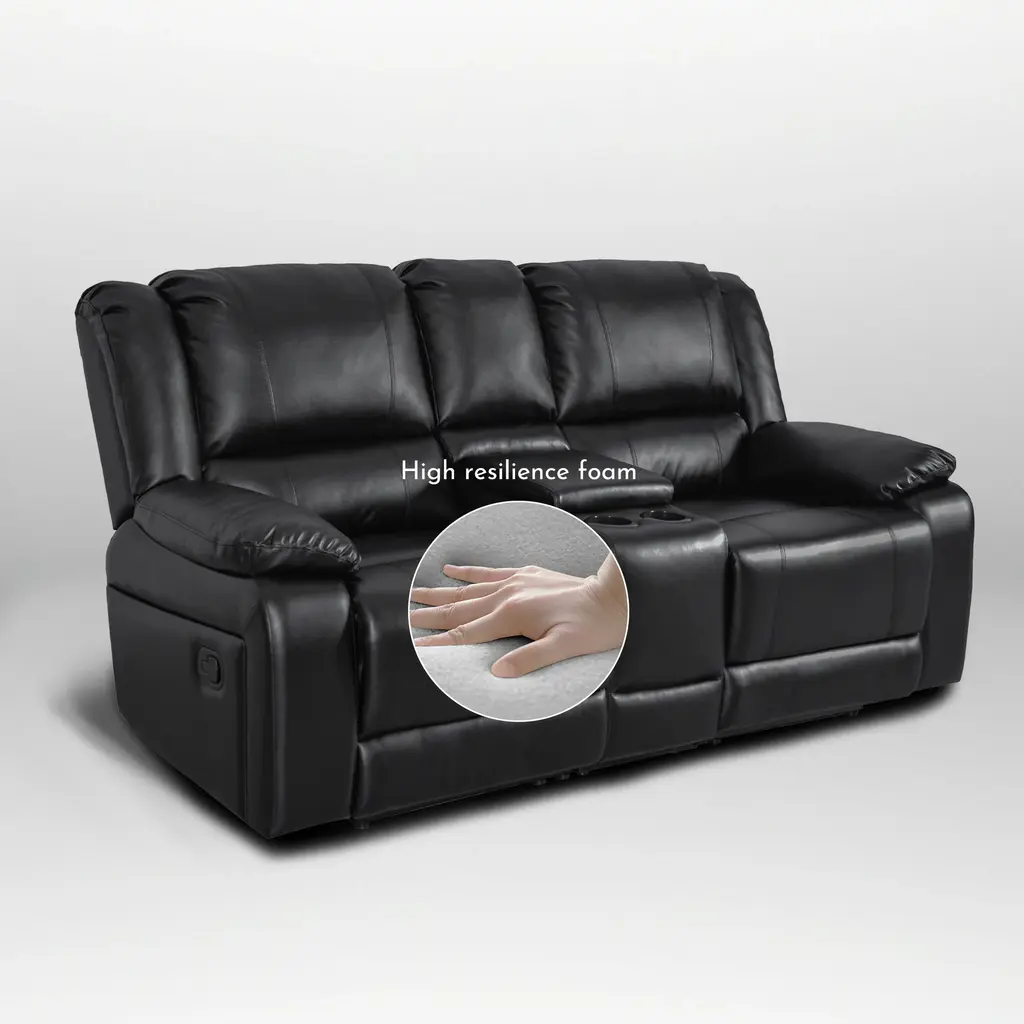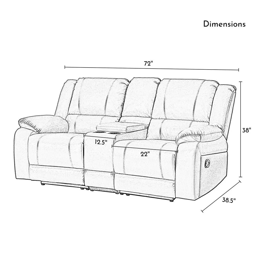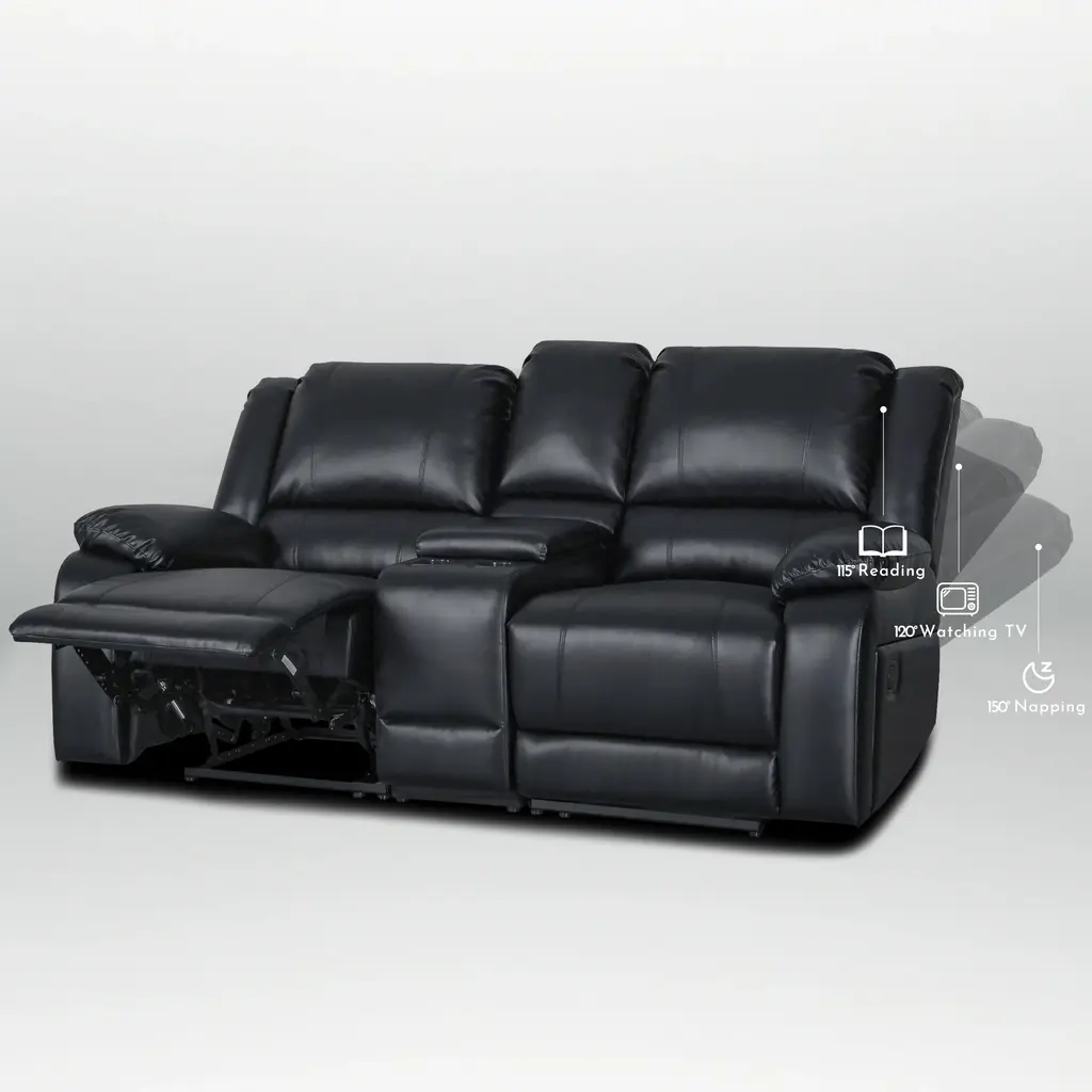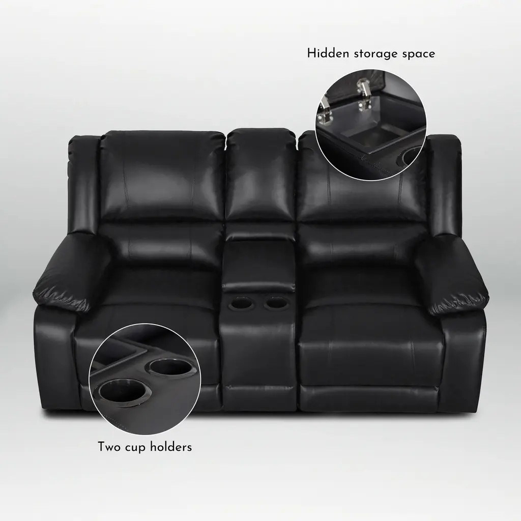 72" Modern And Contemporary Black Faux Leather Manual Reclining Loveseat With Console Description:This contemporary living room sectional is a fabulous trendsetter in every regard. It is decked with an almost endless list of exciting features. Firstly, It can conveniently seat 5 people and is stuffed with a pocket coil spring with foam for extra cushioning. It is crafted with finest faux leather upholstery and installed with a recliner mechanism for comfortable seating. It contains a single recliner on each end, two arm-less reclining chair and two center console for easy storage with 2 built-in convenient cup holders. Product Dimensions: 72"W x 37.8"L x 38"HFeatures: - Manual reclining contains a single recliner on each end. - Super soft seating and back cushions. - Center console flips up to reveal additional storage. - Modular sofa groups. Can combined into different configurations. - The arm side view design made the sofa looks more valuable. - Removable backs allow for easy lifting and maneuvering through doorways.