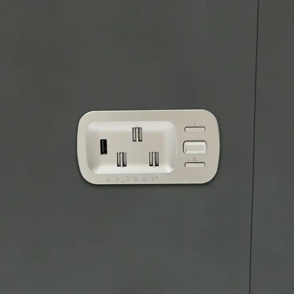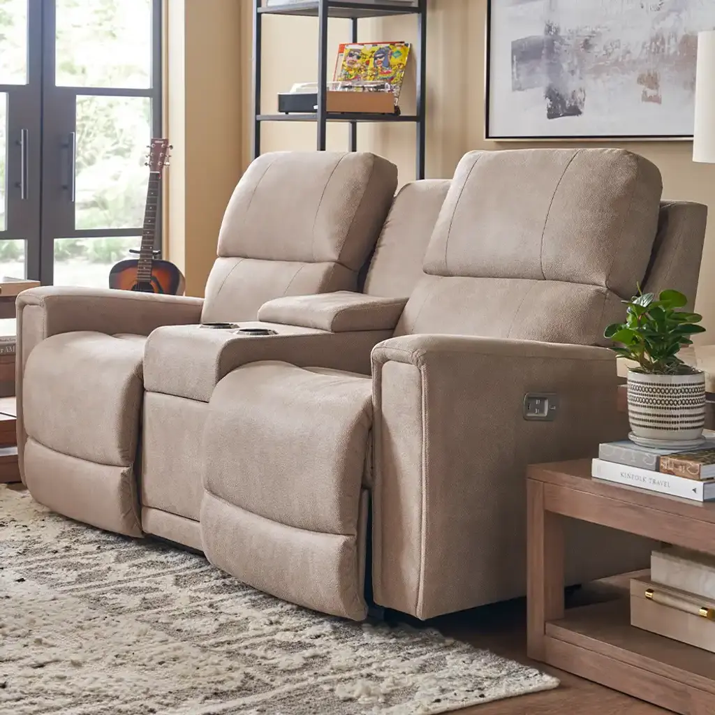 Sleek padding adds modern flair to the Apollo Power Reclining Loveseat with Headrest and Console. Tall backs recline and bucket chaise seats with legrests offer a cozy space to land. A handy center console keeps drinks and remotes in your orbit.