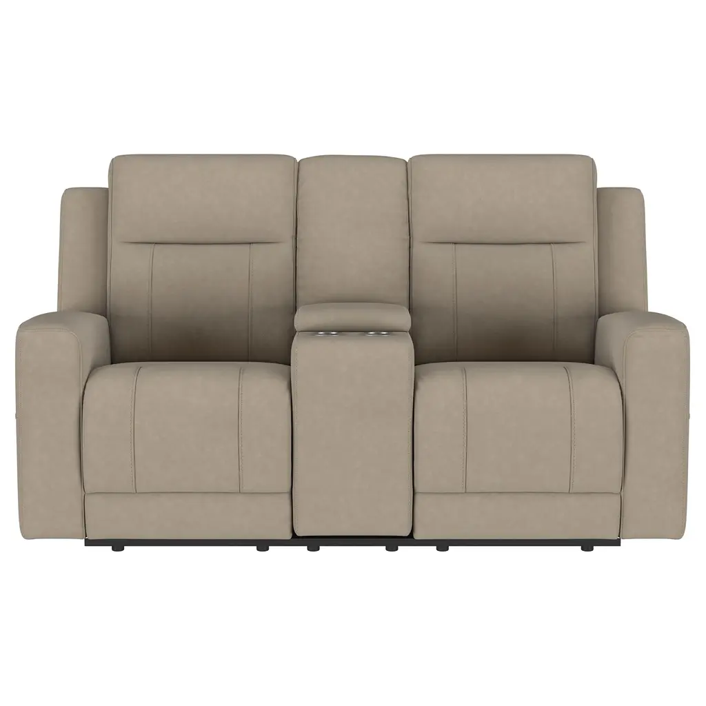 Revamp your living room or den with the inviting comfort of a modern reclining loveseat. Complete with a center console that adds storage and a pair of cupholders, this loveseat is sure to become your favorite on movie nights and game days. It features sleek track arms with modern tufted accents that create impeccable support. Suede-like upholstery has a soft, matte effect, perfect for augmenting with neutral appeal. Add a pair of throw pillows to bring a personal touch to this look. Options: Item Contents: Item Bullets: Materials: Features: Dimensions: Accessories pictured are NOT included.