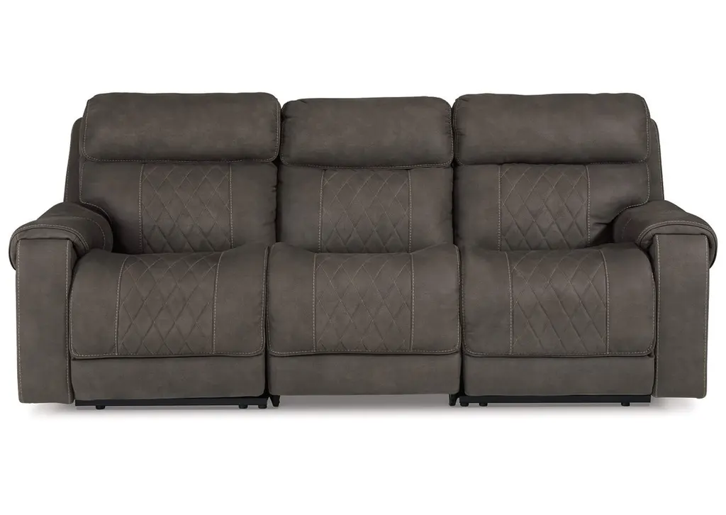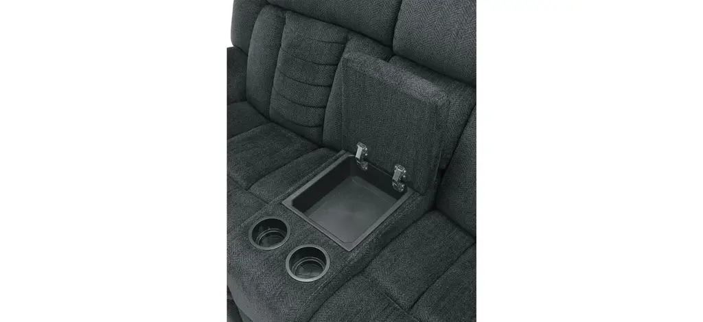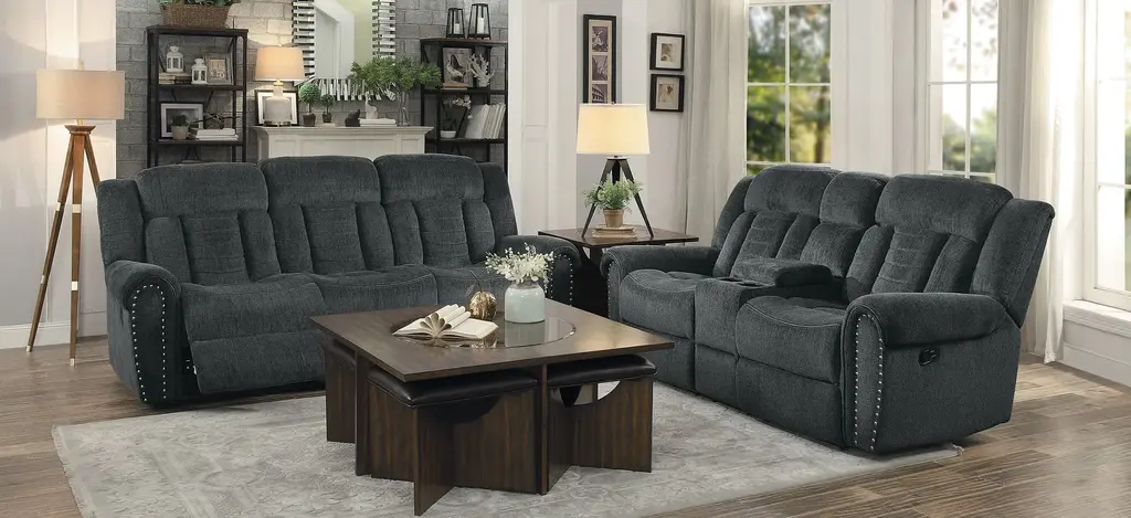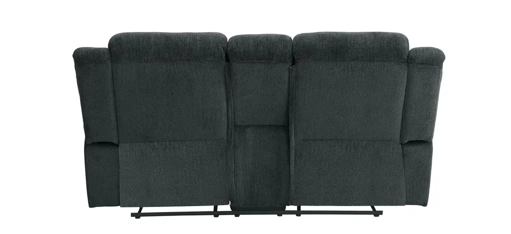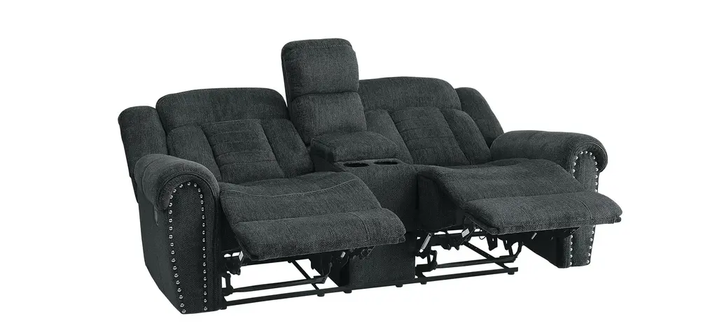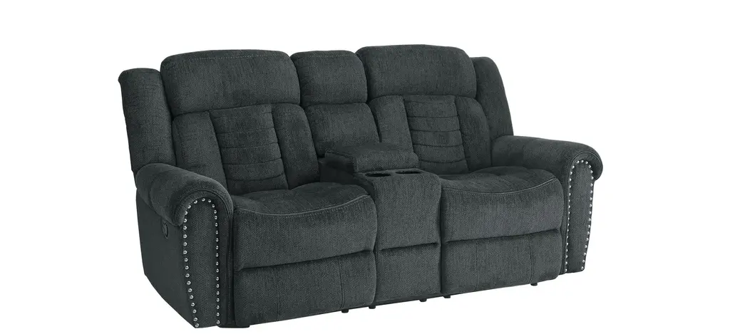 Designed for maximum comfort and styled for the transitional home, the Casella reclining loveseat is a study in comfort. Contoured seating cradles you as you relax into the plush seatbacks. Charcoal gray textured fabric is highlighted by nailhead accent and contrast contour welt, defining the profile of the collection. Manual motion mechanisms operate with the pull of a side-mounted tab, that once engaged, take you from seated to reclined in an easy motion.