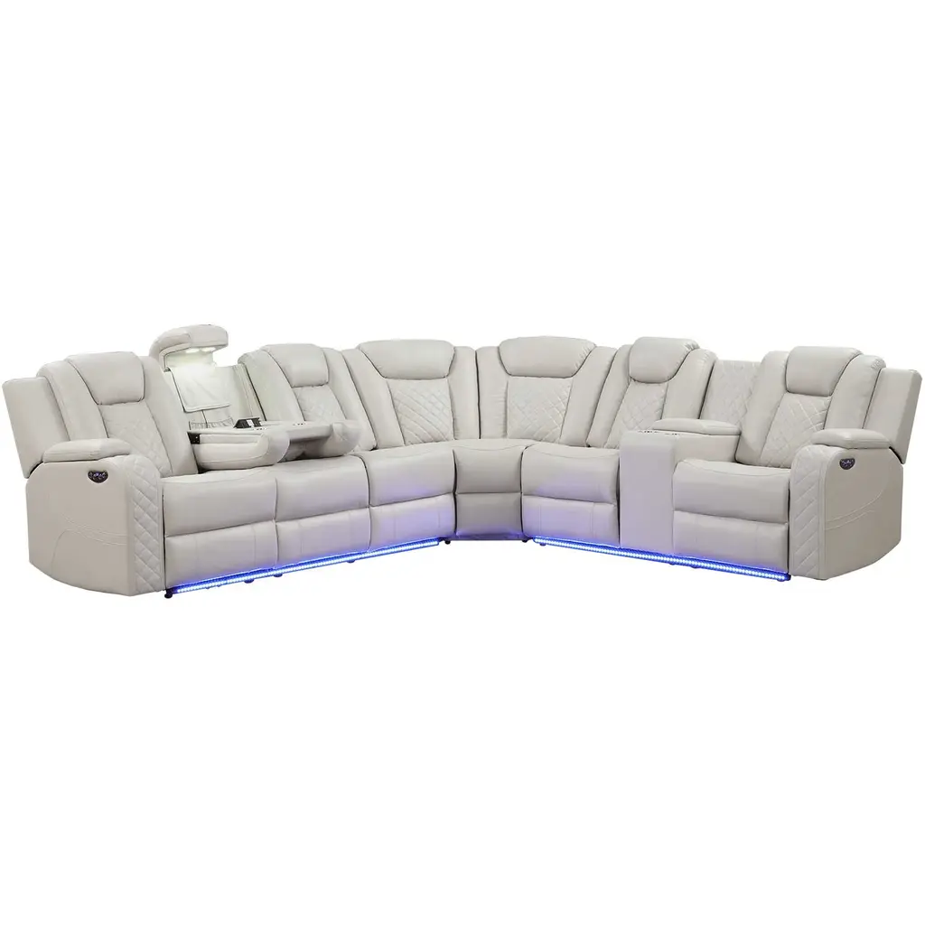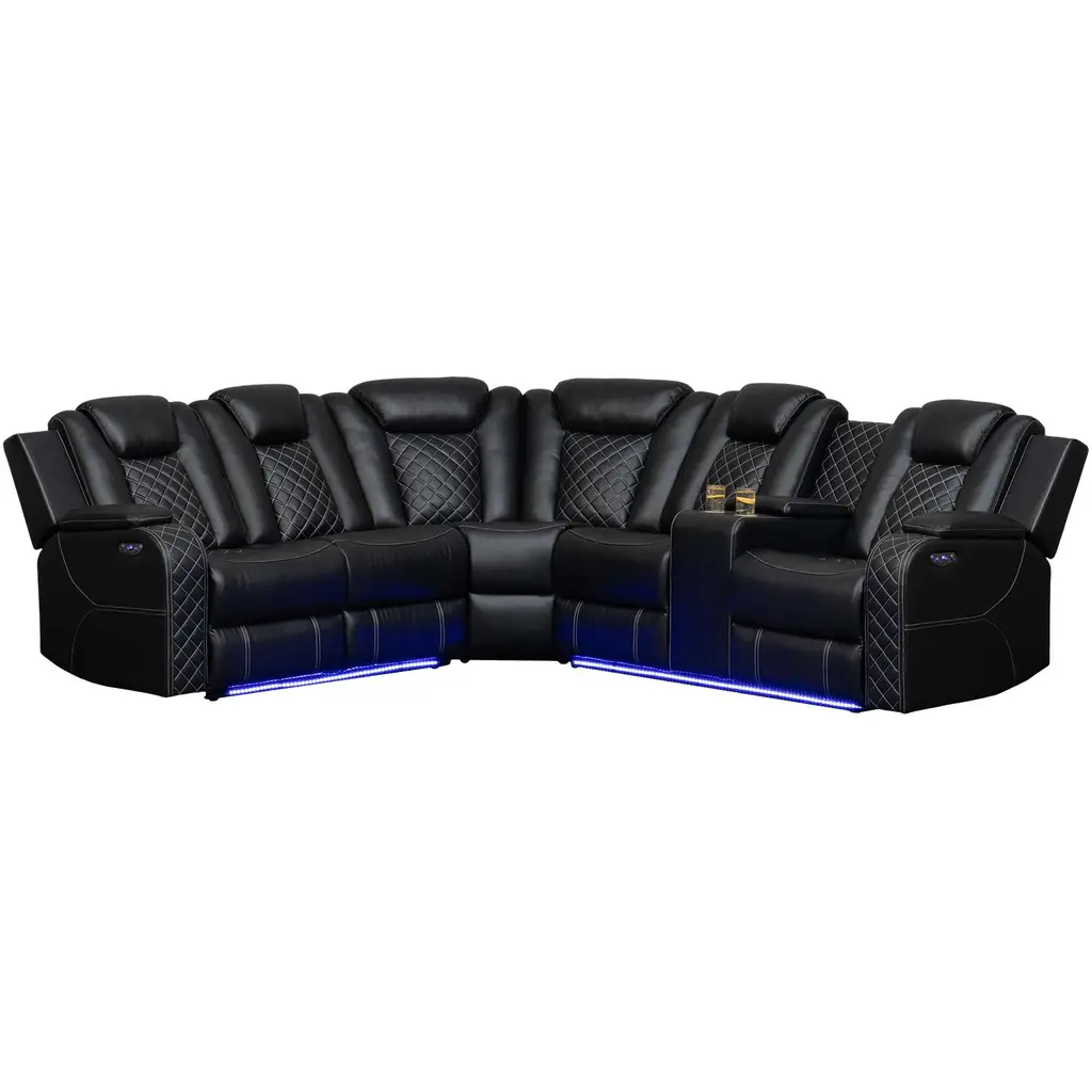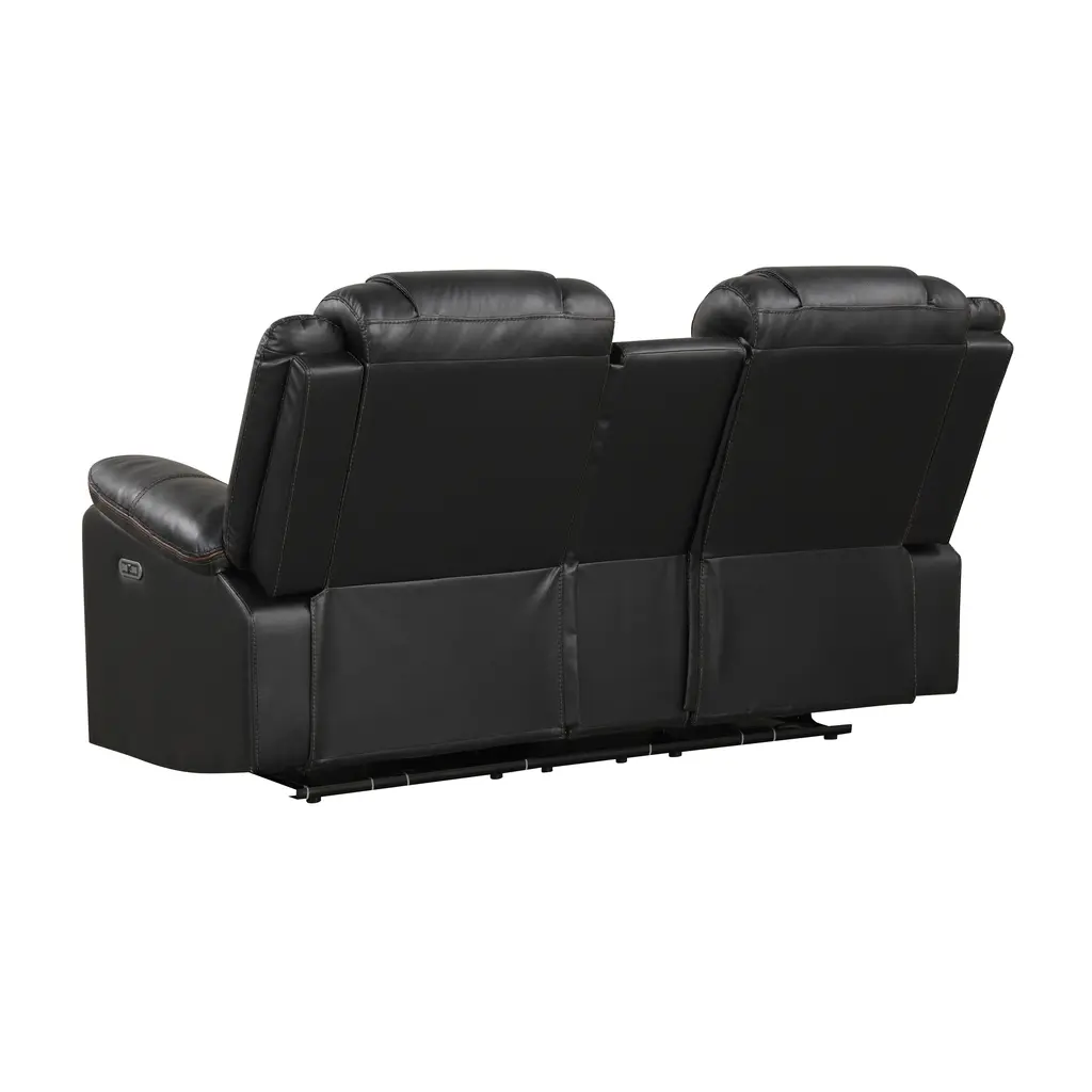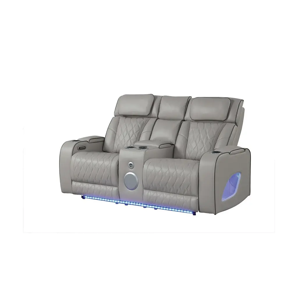 Upgrade your relaxation experience with this stylish power reclining loveseat, designed for modern comfort and entertainment. Upholstered in premium faux leather, this loveseat features a sleek contrasting accent detail. Built-in Bluetooth speakers deliver immersive sound, making it perfect for movie nights or music streaming. The center console includes two cup holders and a hidden storage compartment to keep essentials close at hand. Power reclining functionality lets you find your perfect lounging position, while integrated USB ports ensure your devices stay charged. Completing the design, LED lighting at the base adds a stylish, ambient glow for a cinematic touch. • Premium faux leather upholstery • Built-in Bluetooth speakers for an enhanced entertainment experience • Power reclining function for personalized comfort • Center console with two cup holders and hidden storage • Integrated USB ports for convenient device charging • LED lighting at the base for a modern, ambient touch