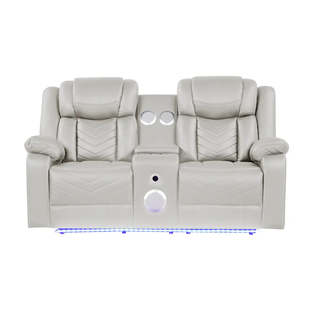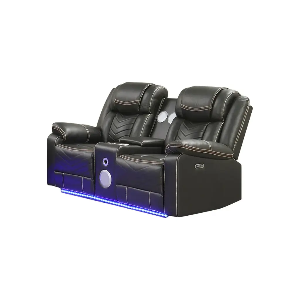 Upgrade your relaxation experience with this stylish power reclining loveseat, designed for modern comfort and entertainment. Upholstered in premium faux leather, this loveseat features a sleek contrasting accent detail. Built-in Bluetooth speakers deliver immersive sound, making it perfect for movie nights or music streaming. The center console includes two cup holders and a hidden storage compartment to keep essentials close at hand. Power reclining functionality lets you find your perfect lounging position, while integrated USB ports ensure your devices stay charged. Completing the design, LED lighting at the base adds a stylish, ambient glow for a cinematic touch. • Premium faux leather upholstery • Built-in Bluetooth speakers for an enhanced entertainment experience • Power reclining function for personalized comfort • Center console with two cup holders and hidden storage • Integrated USB ports for convenient device charging • LED lighting at the base for a modern, ambient touch