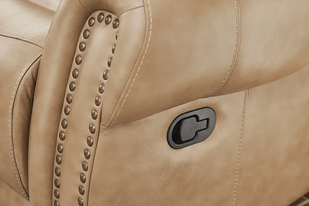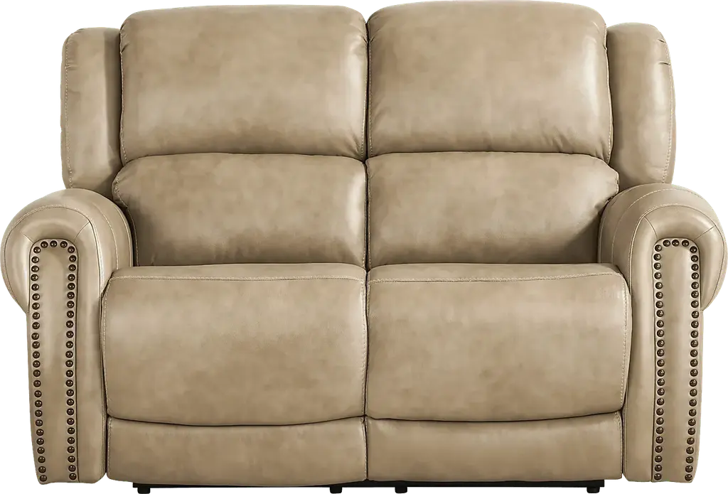 Sinking into a sanctuary of plush indulgence adds the perfect pause to the daily routine - and the classic elegance of the Churchill reclining loveseat provides the luxury landing pad that family and friends will look forward to. Taupe top grain leather where the body touches hugs soft, traditional style curves to offer up highly inviting attached cushions. Easy manual reclining in each seat offers up the perfect angle for total relaxation. Top-stitched seams throughout create a tailored look, accented by gleaming nail head trim on each roll arm. Upholstery: top grain leather where the body touches, vinyl sides and back.
