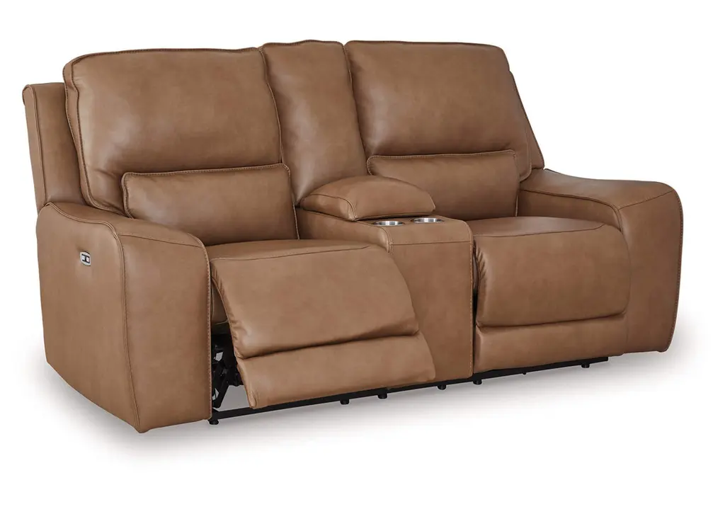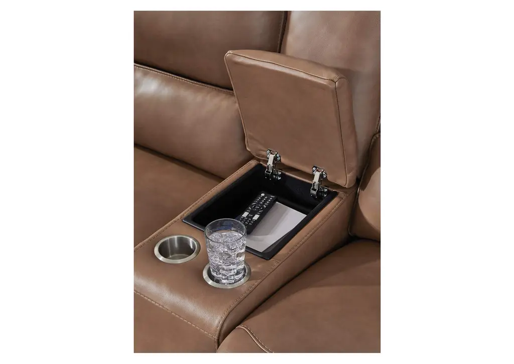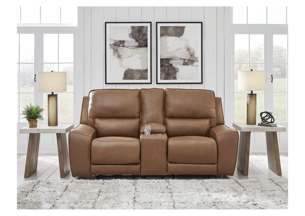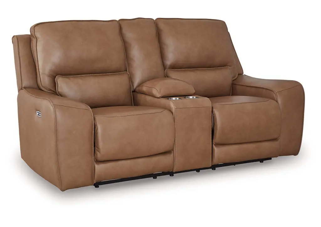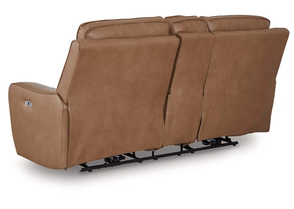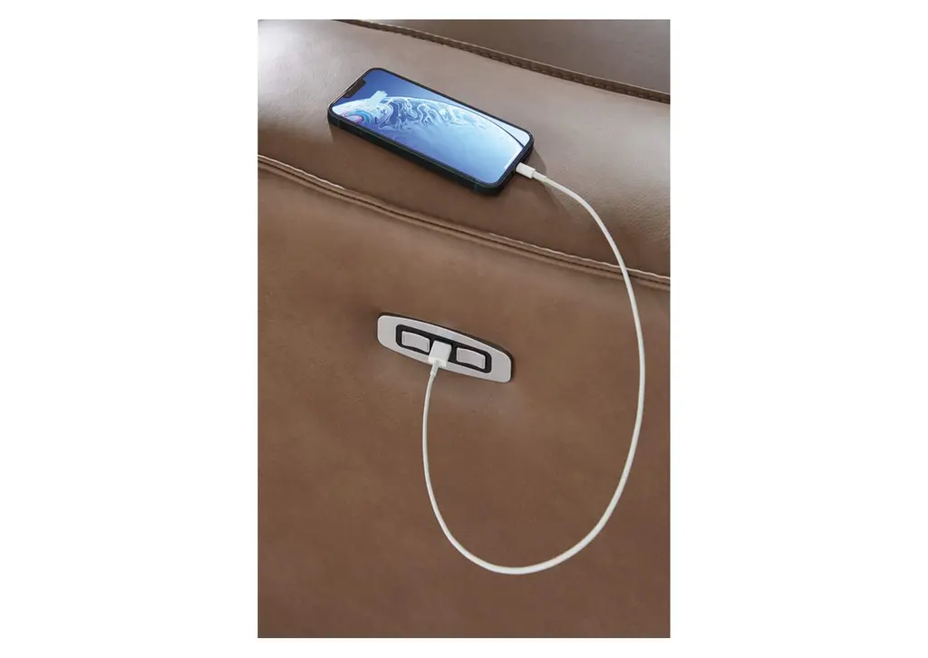 Live and lounge luxuriously. This power reclining loveseat brings an ultra-stylish flair to your home’s central hub. Its seating area is wrapped in top-grain leather in a rich caramel coloration, giving you a trend-right look made all the better with high-quality materials. And with the simple push of a button, you can recline or adjust the headrests to find your ideal comfort position. Weight 275.000 lbs. (123.75kgs.)