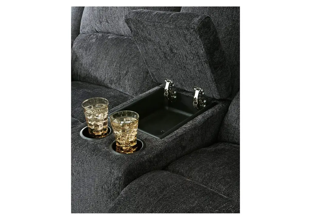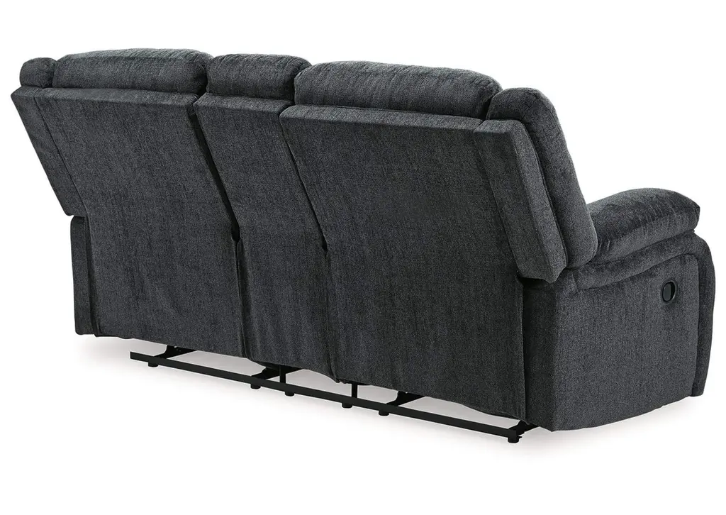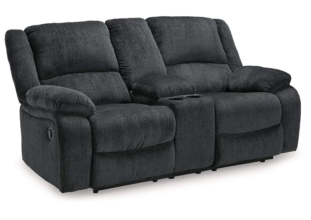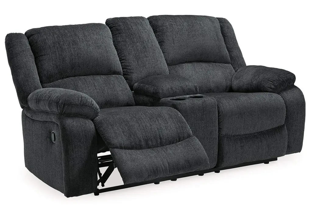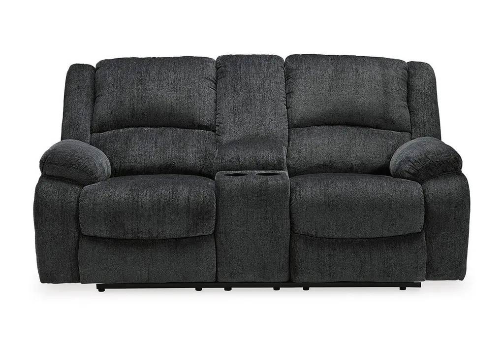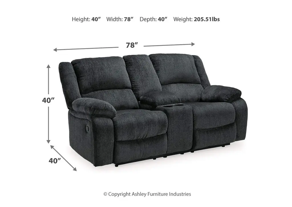 Built for luxury, the Draycoll reclining loveseat with center console lets you kick back in reliable style. The thick, softly textured chenille upholstery provides a comfy surface on which to lounge. With bustle back construction and thickly cushioned armrests, this piece gives you the dependable support you need to unwind with the convenience of the center console to ease your evening. Weight 205.510 lbs. (92.48kgs.)