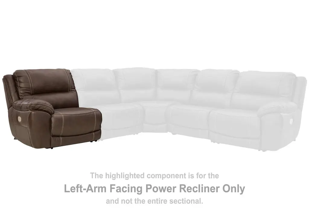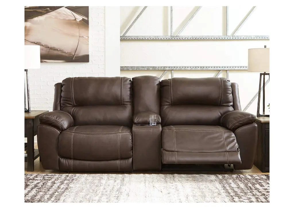 Load up on comfort in a cool, clean-lined and contemporary way with the Dunleith power reclining loveseat with console in chocolate brown. Rest assured, the expertly matched leather and faux leather upholstery is enriched with a pebble grain effect for authentic appeal and enhanced with jumbo stitching for dramatic contrast. It features a one-touch power control with adjustable positions, along with an Easy View™ adjustable headrest that allows a primo view of the TV even when you're reclined. Extended ottomans provide extra length for leg comfort. A zero-draw USB plug-in at your fingertips lets you charge up as you chill out. Weight 302.000 lbs. (135.9kgs.)