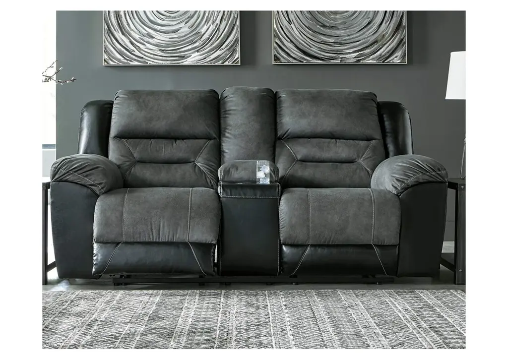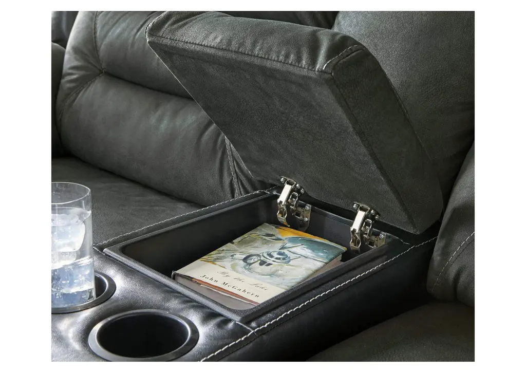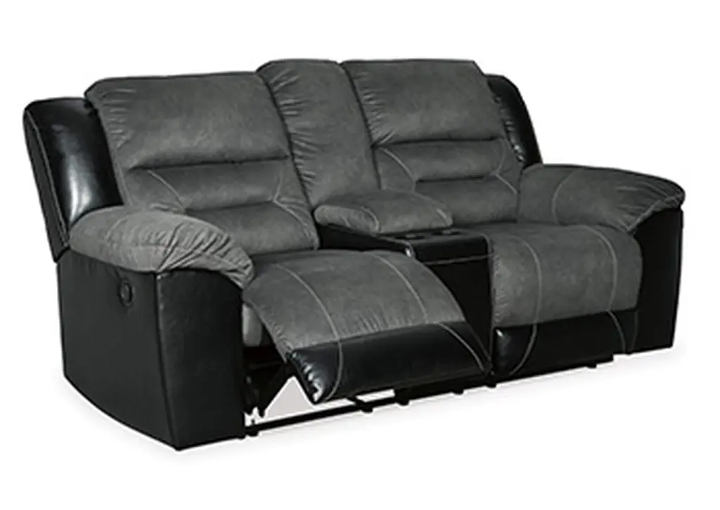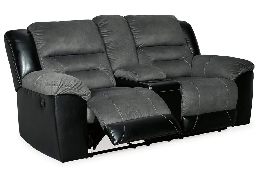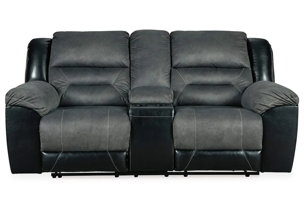 Every day is a good day with this reclining loveseat around. Take a load off and forget your worries as you ease back into the luxurious feel of suede-like fabric. Need more comfort and support for your body? Cue the deep seating and tall back. Contrast jumbo stitching adds an element of style to the cushions. Easily place drinks and small living room essentials in the center storage console with cup holders.