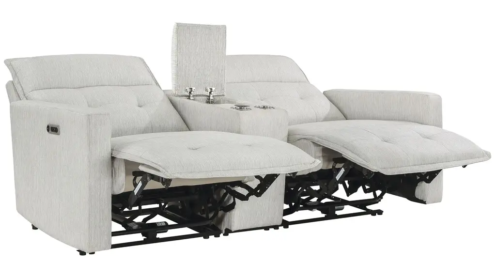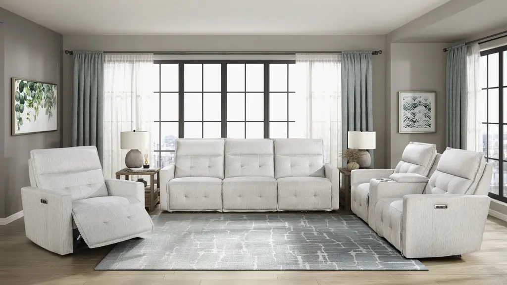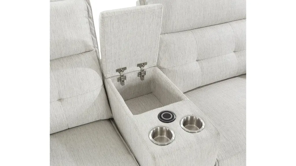 With an expanse of seating to fill your living room, the Fitch Power Double Reclining Loveseat lends modern style, function, and comfort to your home. Hemp white textured fabric upholstery covers the love seat, with console, it's light hue an airy palette for your decorative preferences. Power-enhanced reclining functions support ease of movement for the power left and right recliners. The console features a wireless charging pad, and cupholders while the corner unit anchors the sectional's seating expansion, and the armless chair provides movement-free seating. The seating profile of the collection features knife-edge tailoring, and contour stitching, each element lending to the modern aesthetic.