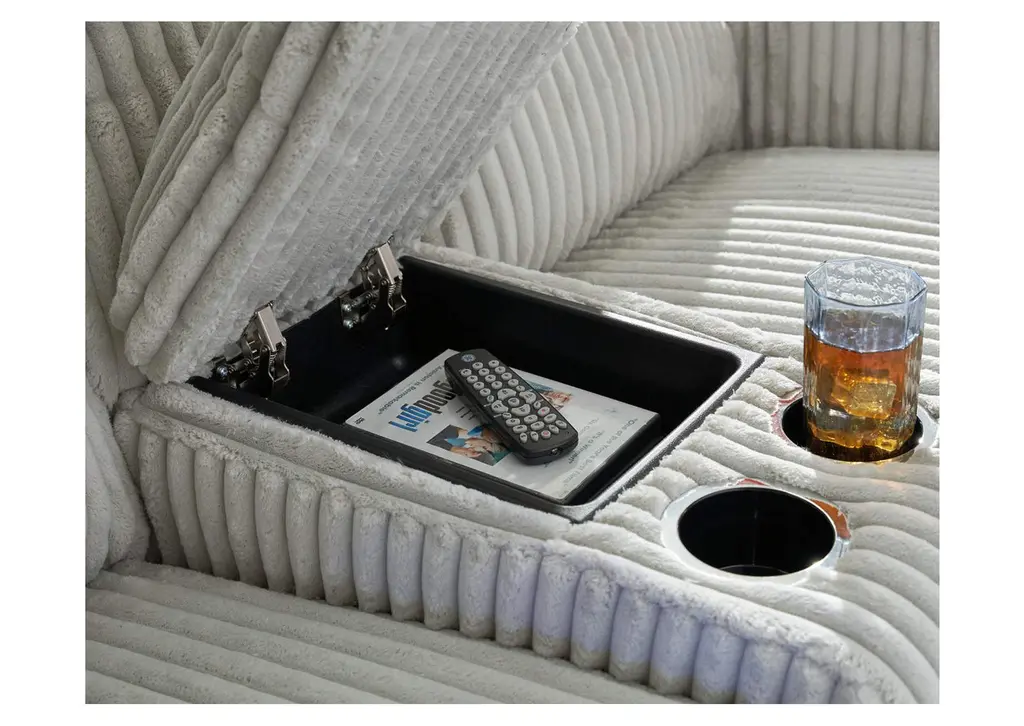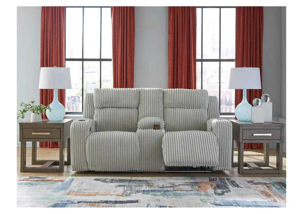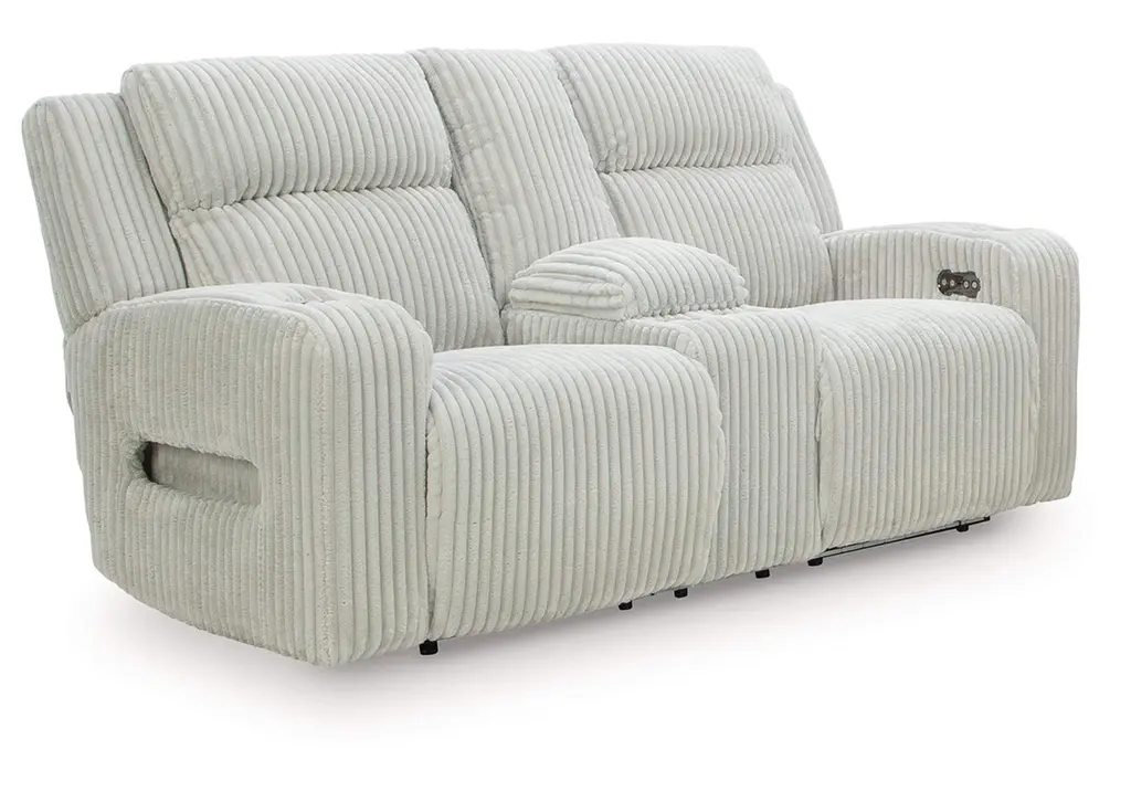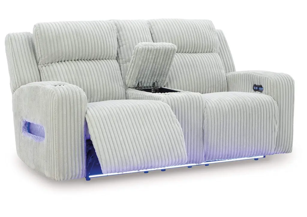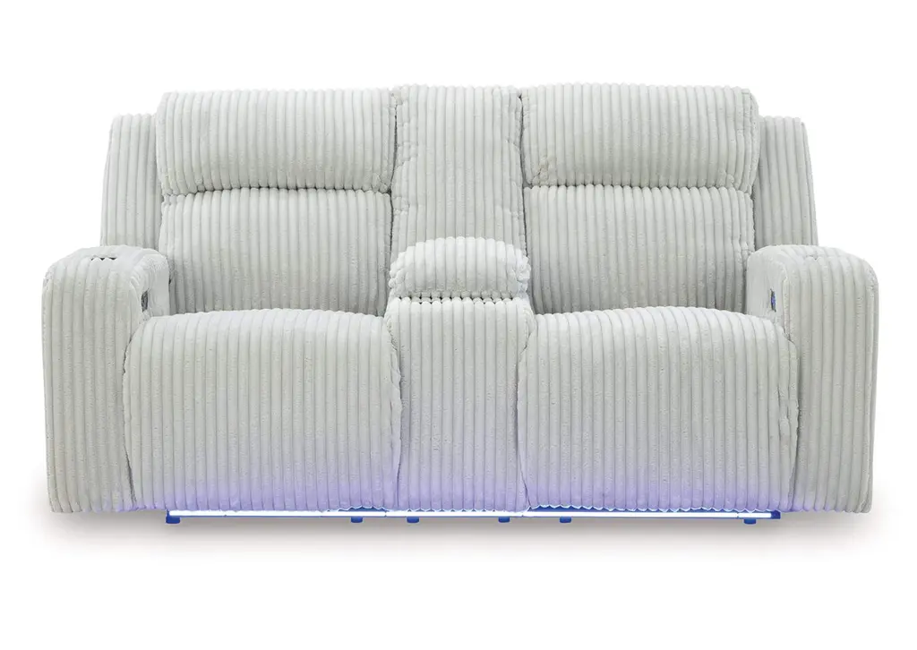 Trend-right style, meet irresistible modern function. Your living room gets a cozy-cool upgrade with the TwinBrooke power reclining loveseat. Curl up in its ultra-chic corded upholstery and recline with one-touch controls. Is it movie night or game time? With ambient LED lighting, this loveseat transforms from a serene relaxation spot to an entertainment hub. Weight 260.000 lbs. (117kgs.)