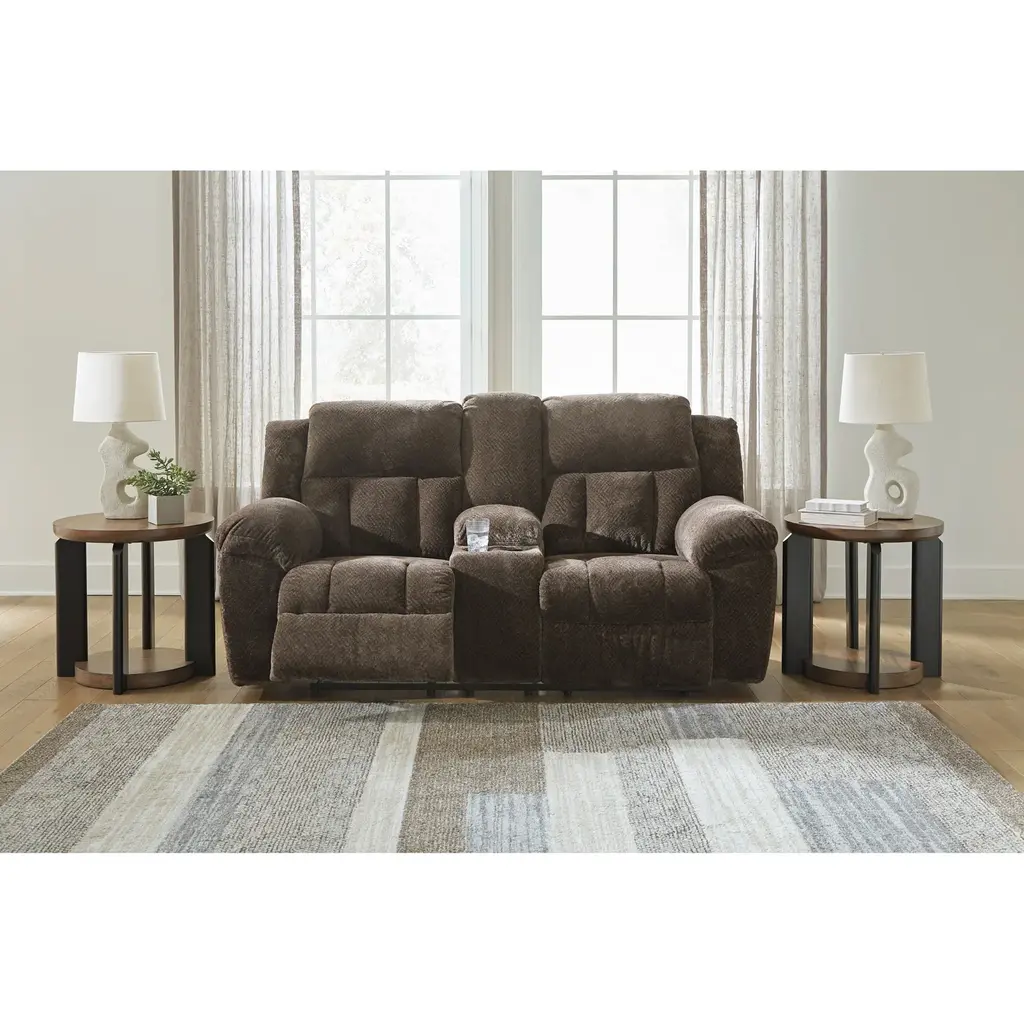 Relax with convenience in the Frohn Console Reclining Loveseat. Featuring dual reclining seats, a center storage console, and built-in cupholders, it’s perfect for movie nights. High-resiliency foam cushions and durable polyester fabric round out this inviting, low-maintenance piece.