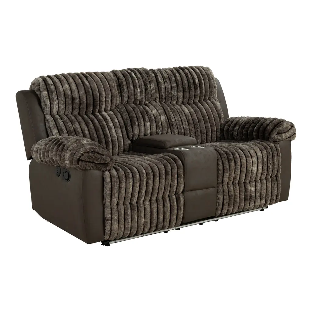 Upgrade your relaxation with this manual reclining loveseat, featuring ultra-soft fake fur upholstery for a plush and cozy feel. The sleek chrome handles offer effortless reclining, while the built-in blue LED lighting underneath adds a modern ambiance. A center console with USB-A and USB-C charging ports, two removable cup holders, and hidden storage provides ultimate convenience for a luxurious lounging experience. Features: Includes one (1) manual reclining loveseat Available in two (2) color options: Brown or Grey SOFT TEXTURE: Fabric is smooth to the touch, easy to lounge and relax on STORAGE: Center storage console with two cup holders for added practicality LED LIGHT: Integrated blue LED lights under the loveseat set a stylish, ambient tone, elevating the atmosphere of your space Transitional style Seats up to 2 people comfortably Materials: Solid wood, engineered wood, fabric, foam Enhance your comfort with this manual reclining loveseat, upholstered in ultra-soft fake fur for a warm and inviting touch The modern chrome handles make reclining easy, allowing for effortless adjustments to your preferred position With a functional center console featuring USB-A and USB-C ports, removable cup holders, and hidden storage, this loveseat combines convenience and luxury Solid wood framework offers a smooth appearance and durable support Matching glider recliner and reclining sofa available, sold separately Instruction manual provided and some tools required for assembly Manual Reclining Loveseat Measurements: Overall: 38 inches high x 72.5 inches wide x 39 inches deep Seat: 19.5 inches high x 22 inches wide x 22-62 inches deep Back height: 18.5 inches Weight capacity: 500 pounds Weight: 155 pounds Whether you are a deal seeker, trendsetter, or just window shopping, Furniture of America® is there for your every need. You'll find that we offer every style, from rustic farmhouse and urban industrial to French antique, mid-century modern, and glamorous chic; we welcome you to explore our ample style possibilities to find the perfect pairing for your personality. Furniture of America® is proud to be the family friend that always has your back. Product Care: To avoid upholstery discoloration and fading over time, do not place in direct sunlight Avoid dragging along floors. Always lift when moving Clean spills immediately by blotting with a clean sponge or towel Spot clean with a soft, dry cloth. Avoid abrasive cleaners or harsh chemicals This product will ship to you in one (1) box.