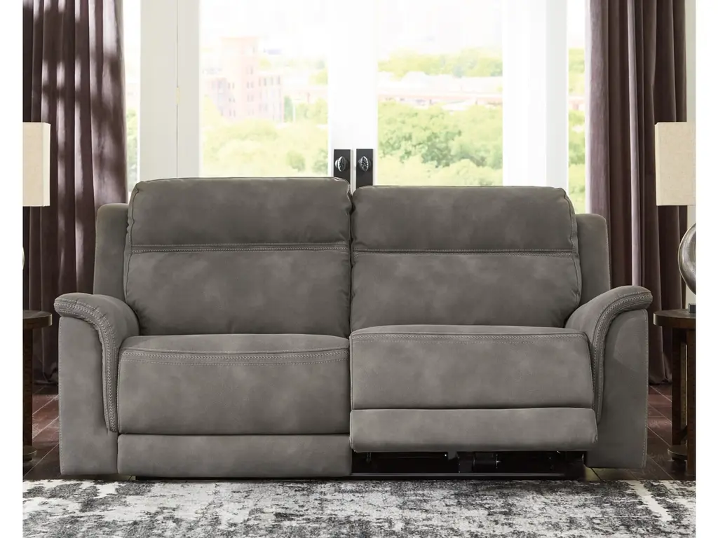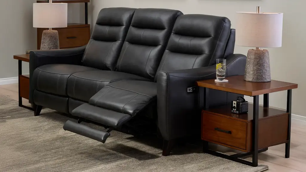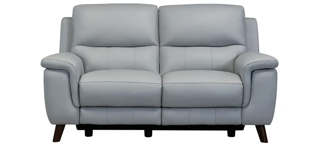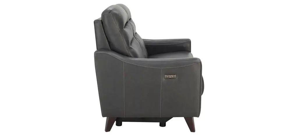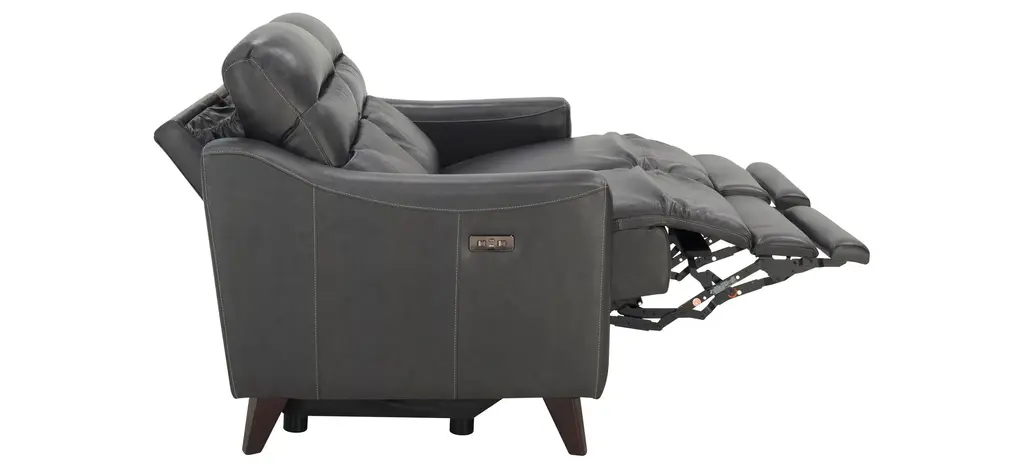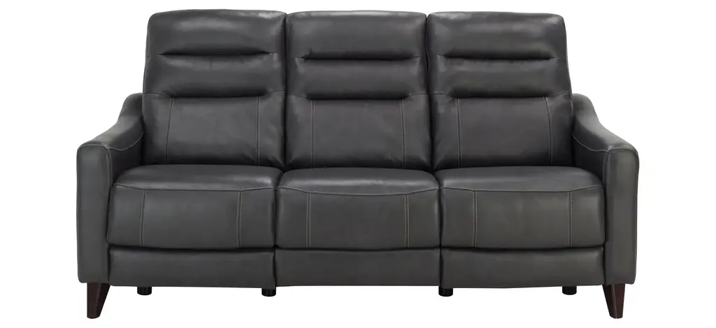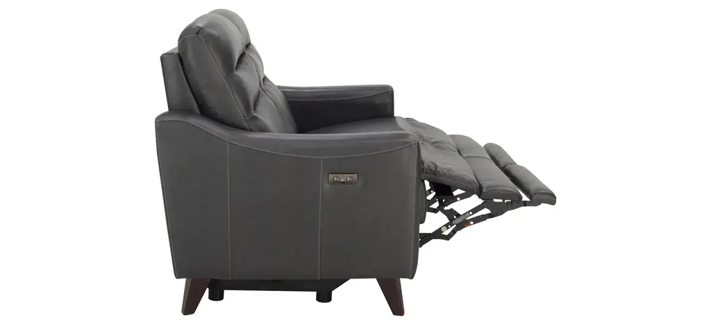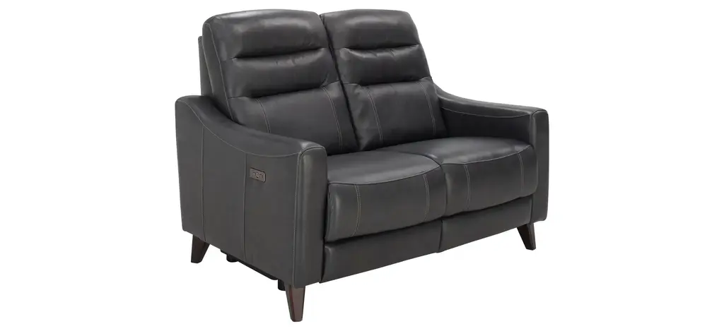 Experience comfort at the push of a button with the sleek leather Graham Power Loveseat w/ Power Headrest. Upholstered in rich, supple leather, it combines contemporary design with ergonomic luxury. Power reclining and headrests help you find your perfect lounging position, while the plush channel-tufted backrests and supportive armrests cradle you in style. Tapered wood legs add a touch of sophistication, making this loveseat a standout piece for any modern living space.