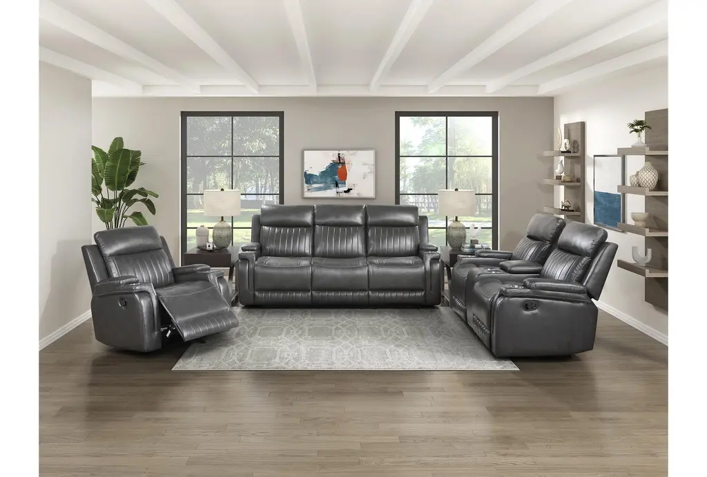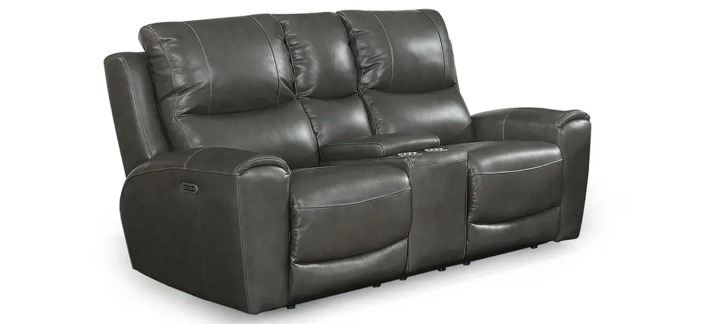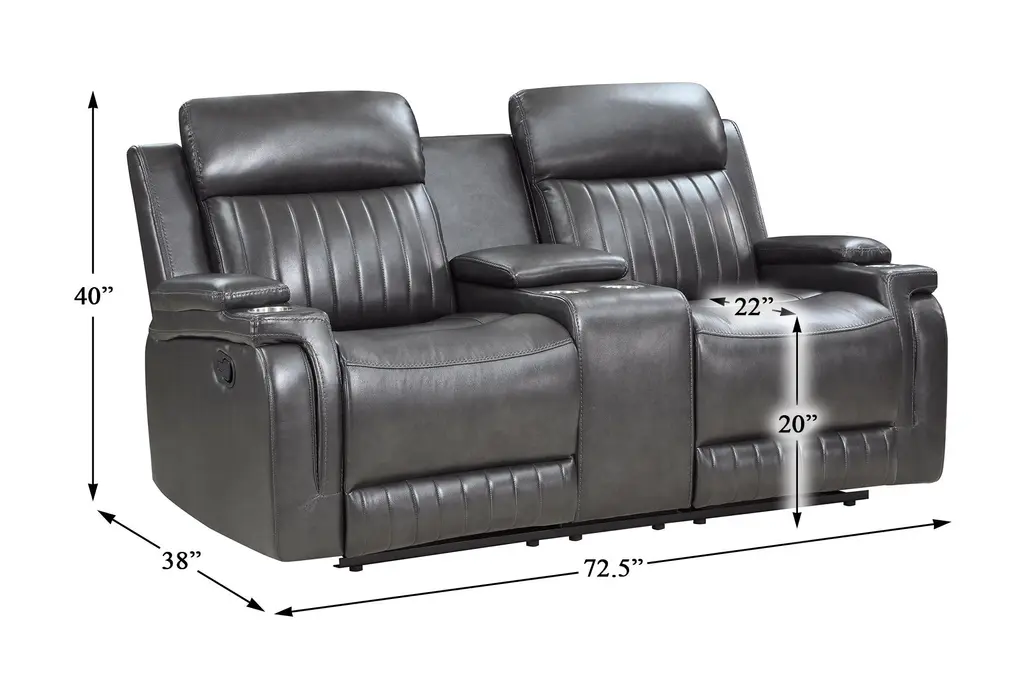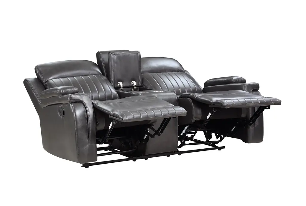 Experience ultimate comfort and convenience with the Kaylene Dark Grey Faux Leather Manual Reclining Console Loveseat. Designed in a casual style, this loveseat features a dark grey faux leather finish that adds a touch of sophistication to any living space. The high-density foam padding over pocket coils ensures maximum comfort, while the tab pull reclining motion allows for easy relaxation. The center storage console with two cup holders provides practical storage and convenience, making it perfect for movie nights or casual lounging.
