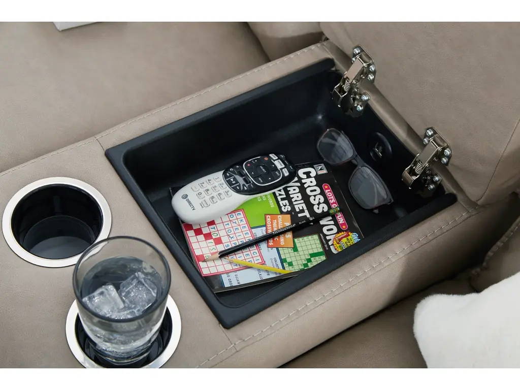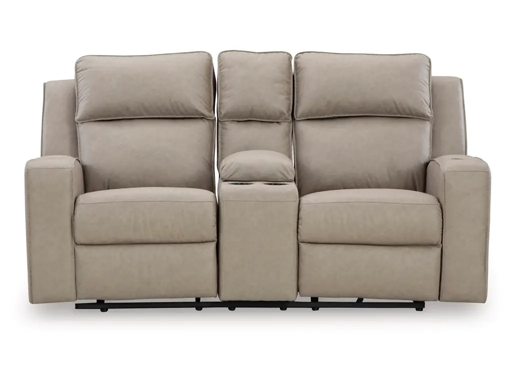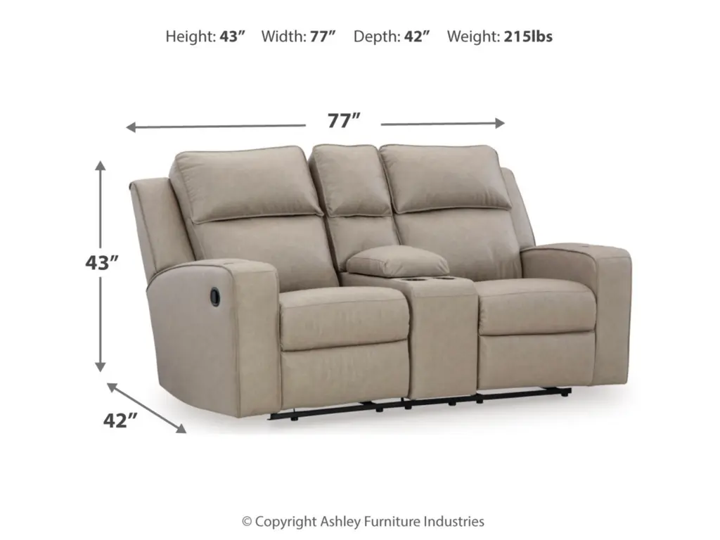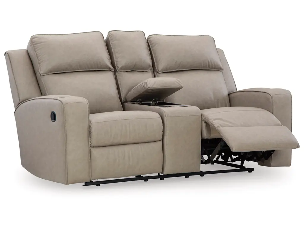 Indulge your lust for comfort and love for contemporary design with the Lavenhorne reclining loveseat. Made for easy everyday living, it’s upholstered in a heavyweight padded faux leather and accented with contrast jumbo stitching for fashion-forward flair. Sleek track arms elevate the look with a touch of modern sensibility. A padded center console with dual cup holders completes the experience.