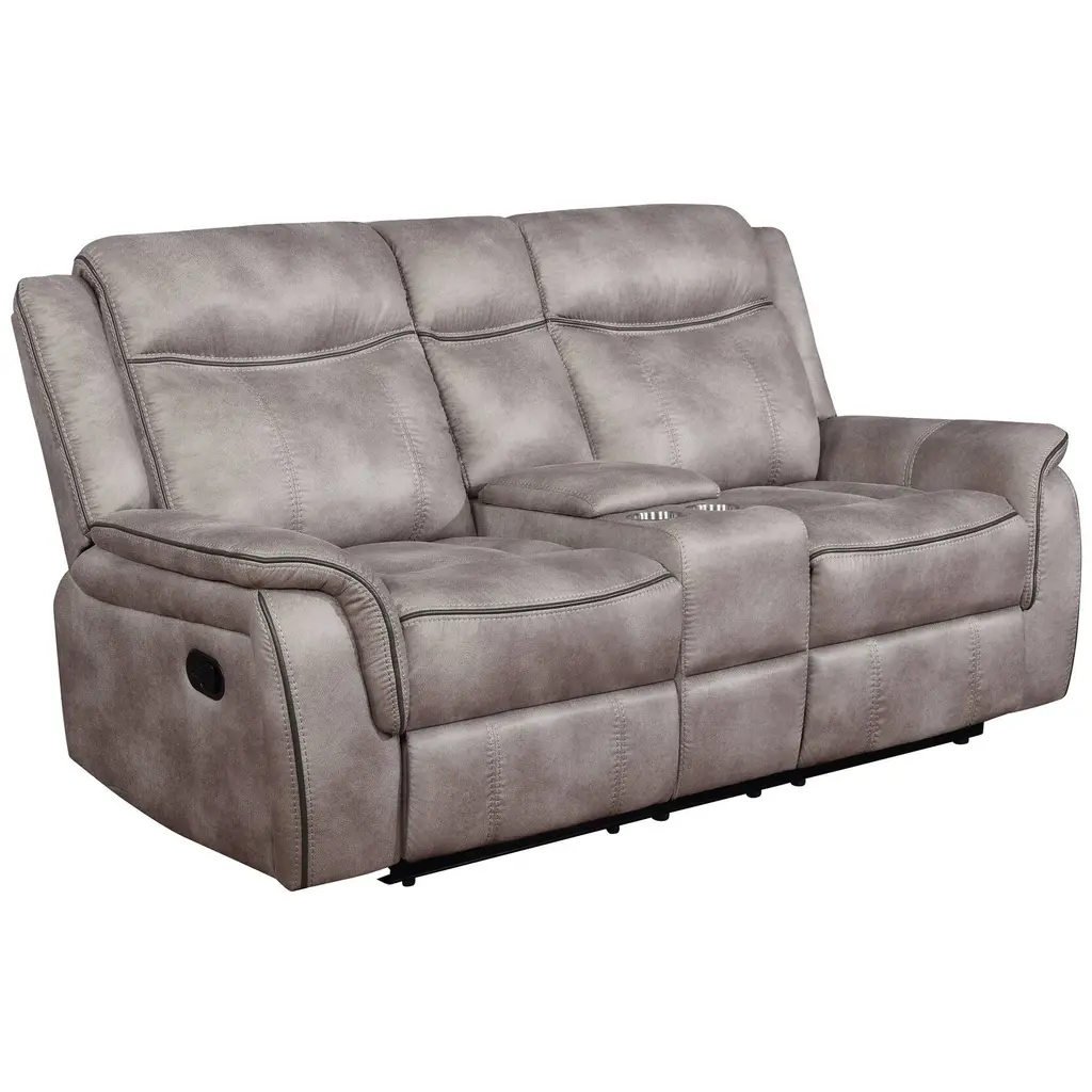 A motion loveseat with console becomes the center of attention in your living space. Fall in love with its microfiber upholstery, making a soft and cozy seating area for all to admire. This motion loveseat is equipped with a manual reclining mechanism for ultimate relaxation. The accompanying center console comes with a lift-top design and storage within. In front of the center console is two stainless steel cupholders to keep drinks on hand. Options: Item Contents: Item Bullets: Materials: Features: Dimensions: Accessories pictured are NOT included.