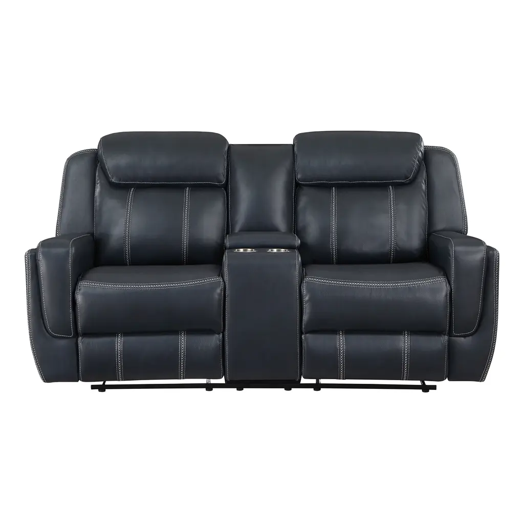 || Fremont & Park - Manuel Collection ||Settle in and get comfortable, the Manuel Collection is ripe with functional accents to elevate your seated experience. Breathable faux leather covers the collection with white contrast stitching defining the modern contoured profile and seats of the collection. The love seat features dual end manual motion reclining mechanisms, their function taking you from seated to prone with the pull of the side-mounted motion tabs. The love seat’s center console features hidden storage, two cupholders, receptacles, and USB ports. This collection offered in blue and black colors. HighlightsAbout CushionsProduct DimensionExplore Manuel CollectionCare InstructionBuyer disclaimer