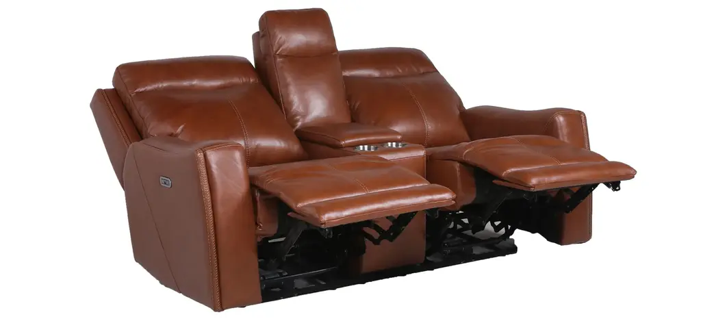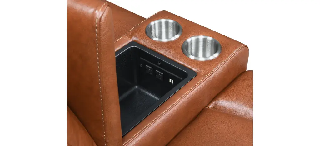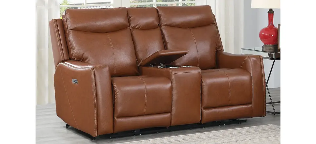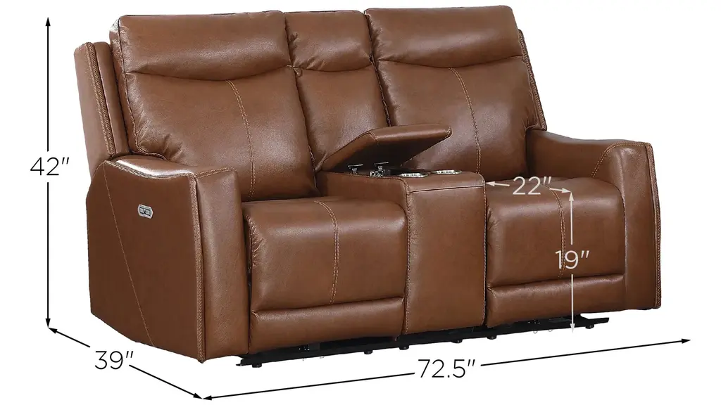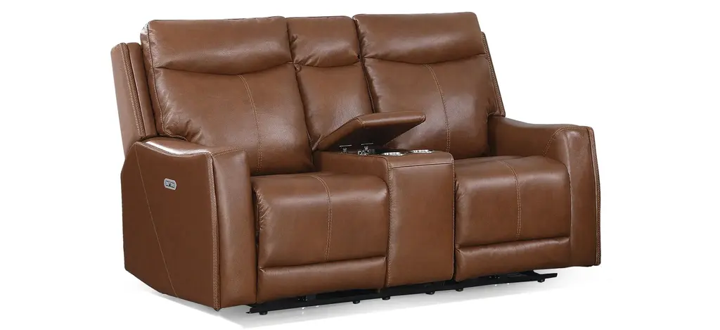 The Natalia Power Recliner Loveseat provides the ultimate in comfort with a soft, pebbled top-grain leather with power articulating headrest and power footrest. Features include a center console with two drink holders and a lift top that reveals storage along with power and USB ports. The reclining control panel features a USB port for recharging plus a home button to return the seat and headrest to their original position.