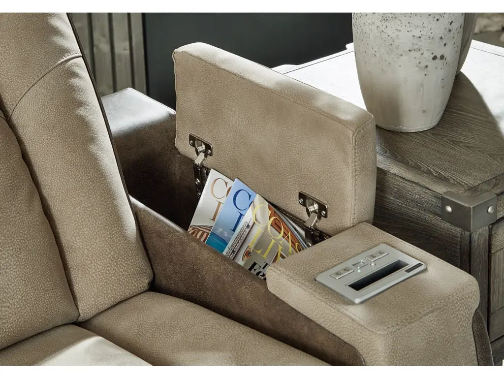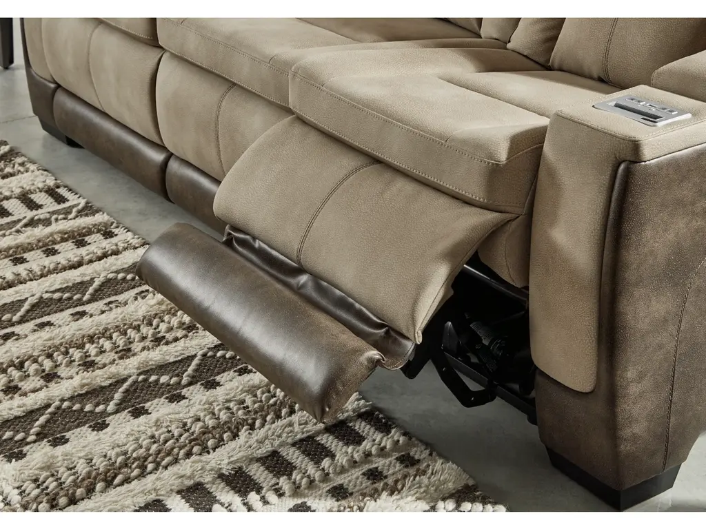 The sleek, ultra-modern Next-Gen DuraPella power reclining loveseat with console has it all. With designer style and head-to-toe comfort, it has the upscale look of leather at a scaled-down faux leather price. Its two-tone upholstery is more durable and water-repellent than regular leather, an added bonus for families. Features including wireless and USB charging, an adjustable headrest and an extended ottoman make this the next generation of power recliners.