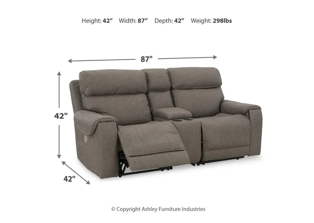Destination: chic comfort. The Starbot power reclining loveseat with console launches your living room into superior form with stellar attention to detail. Exemplifying attainable luxury, its handsome hue has an air of sophistication you’ll long to lounge in. And when you’re done basking in the glow of its sleek style, recline with indulgent motion features to welcome head-to-toe relaxation. Weight 298.000 lbs. (134.1kgs.)