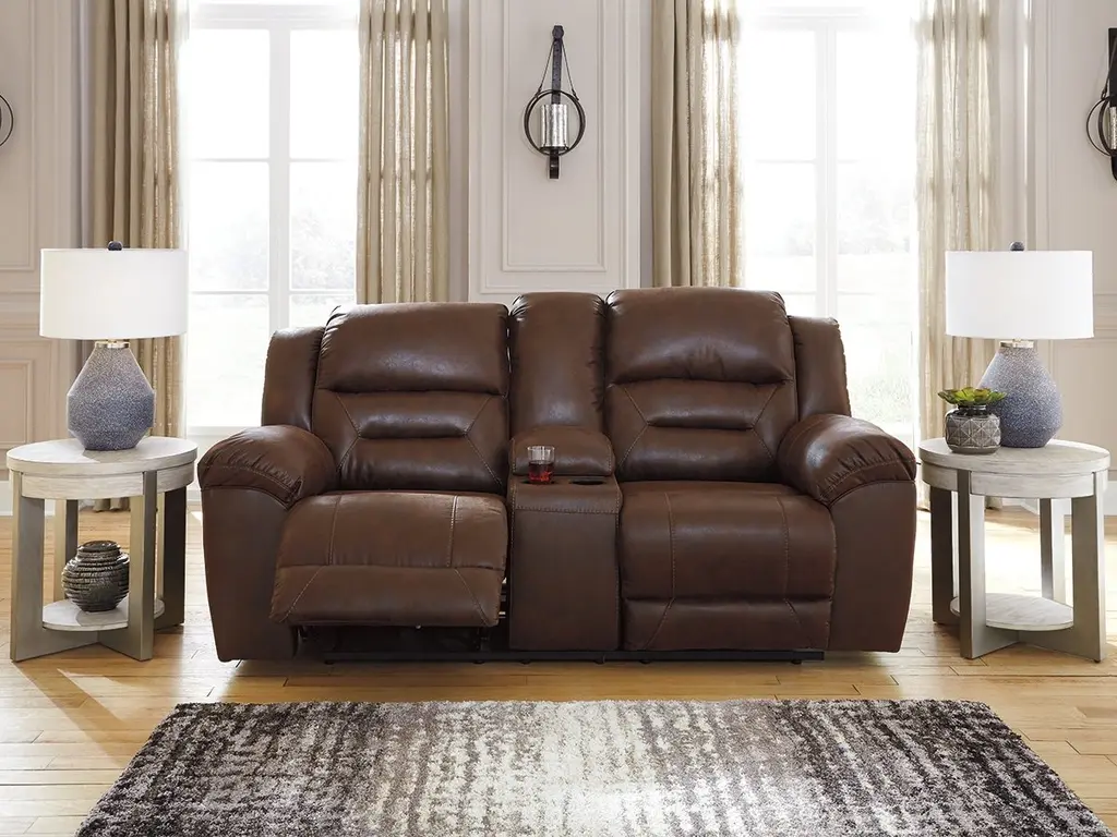 For those who love the cool look of leather but long for the warm feel of fabric, this reclining loveseat with console delivers both with ease. Its high-performance padded faux leather is remarkably durable and easy to clean, making it just the thing for family spaces. Channel-stitched back cushions provide indulgent lumbar support for maximum comfort—not to mention fashion-forward flair.