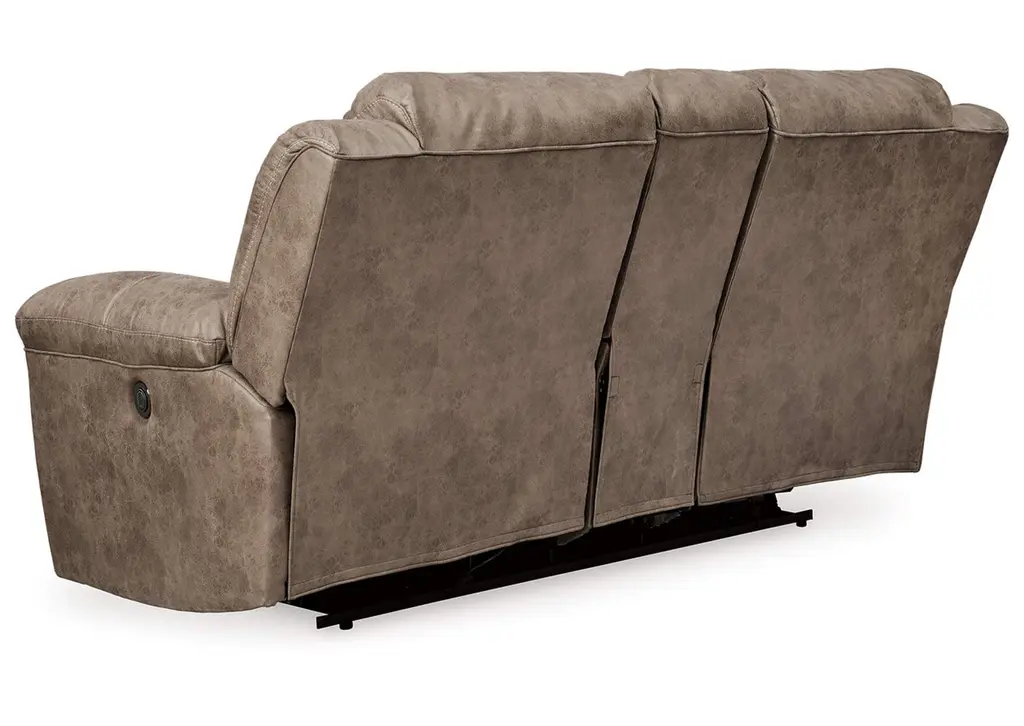 For those who love the cool look of leather but long for the warm feel of fabric, the Stoneland reclining loveseat delivers both with ease. Its high-performance padded faux leather is remarkably durable and easy to clean, making it just the thing for family spaces. Channel-stitched back cushions provide indulgent lumbar support for maximum comfort—not to mention fashion-forward flair. Weight 227.000 lbs. (102.15kgs.)