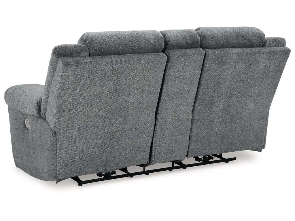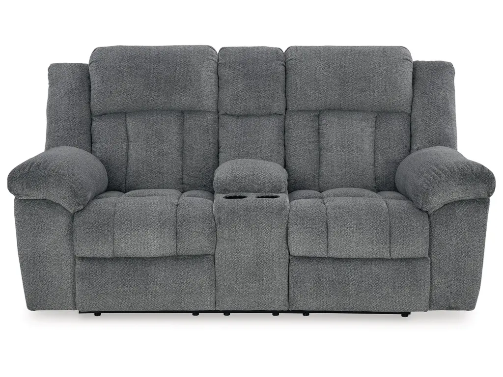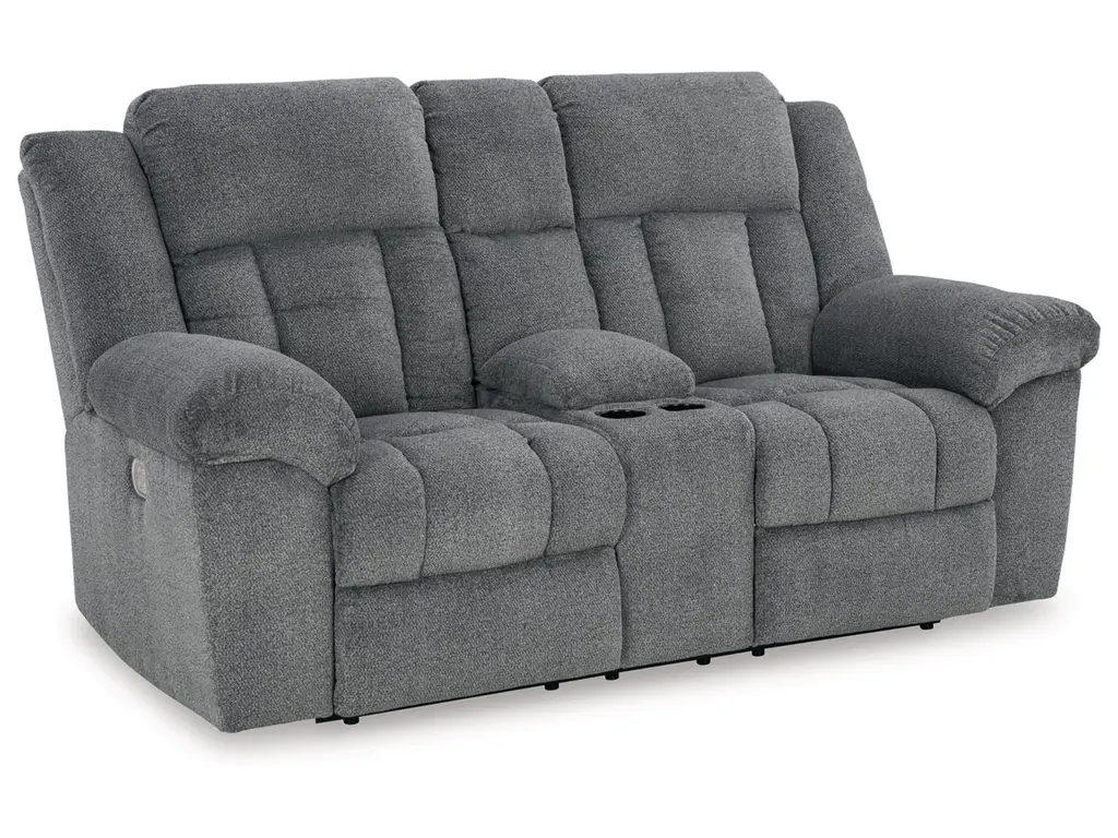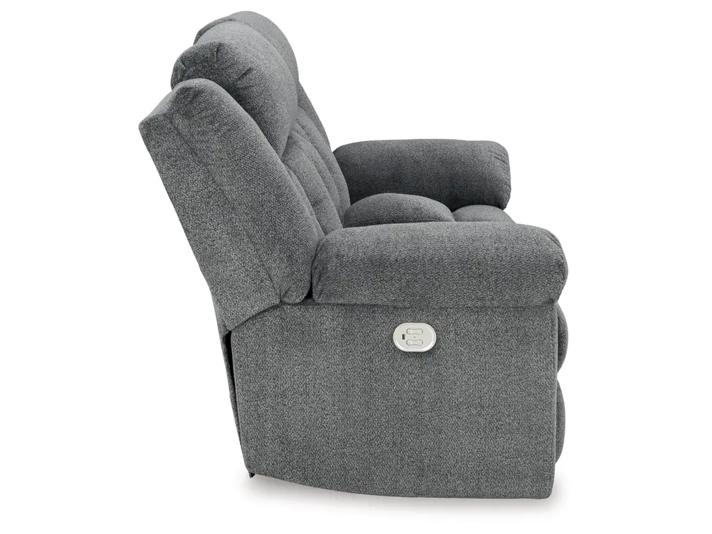 Big, bold comfort. Game time and movie nights meet their match with the Tip-Off power reclining loveseat. Made for ultimate indulgence, an extra-deep seat encourages you to sit back and bliss out. Customize the recliner and headrest to find your ideal viewing position with effortless one-touch controls. And with plush upholstery in a trendy hue, you won’t need to sacrifice style for cozy seating.