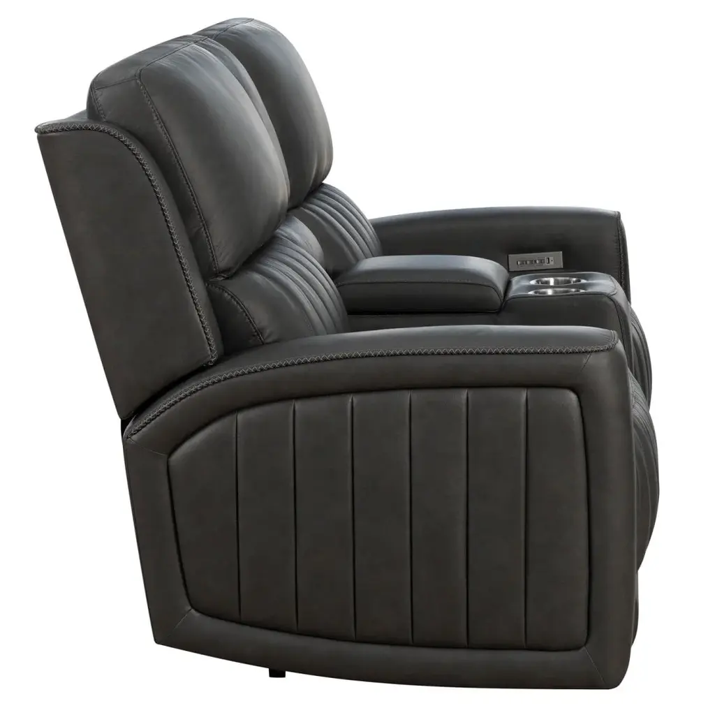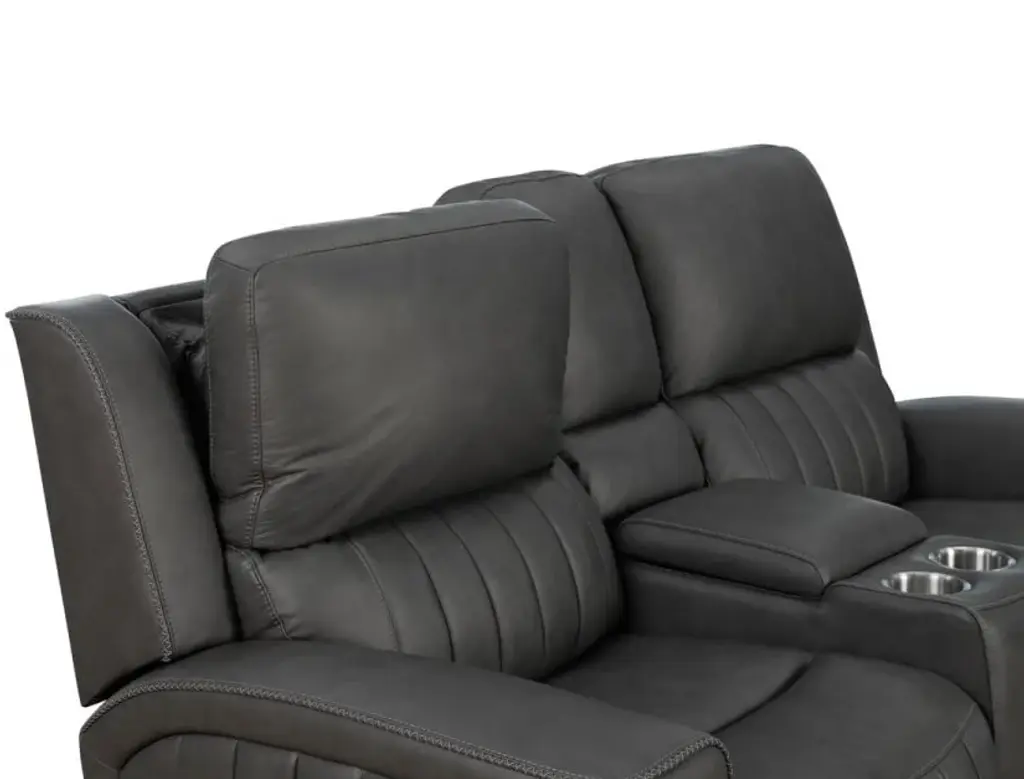 Sporty styling is found in this sophisticated modern reclining group. Features winged split pub channeled back with power headrest, power lumbar and drop-down table with 2 cup holders. Channeled pad over chaise pocketed coil seating fully supports your legs by eliminating pressure points. Large track arms with decorative whip stitching and welt details. Inside the arm power controller for easy access with USB port.