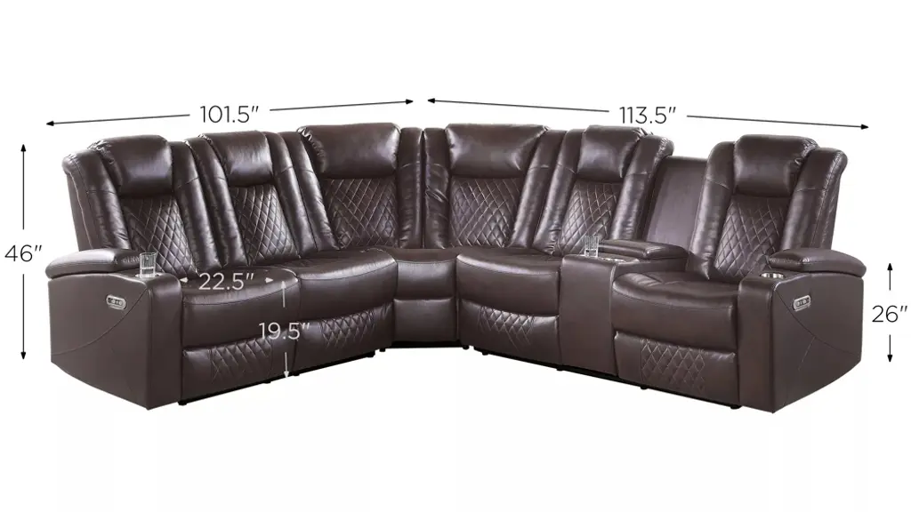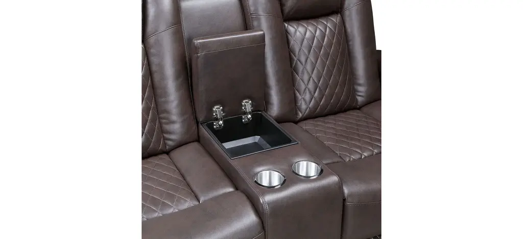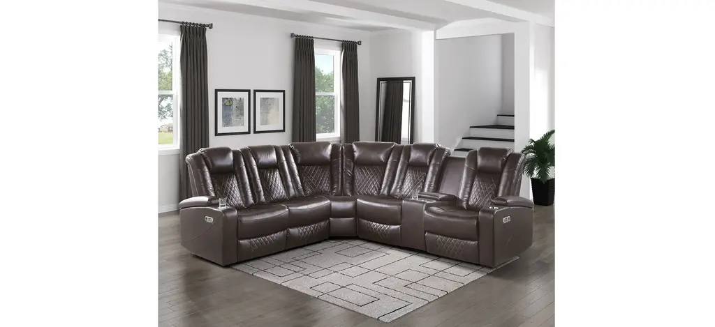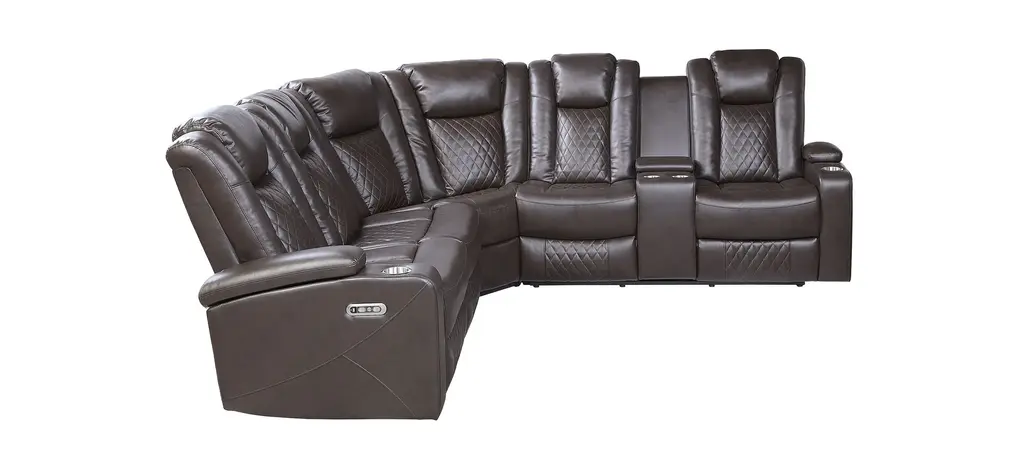 The well-appointed Orina 3-pc. sectional with power headrests pairs functional accessories with plush seating, allowing for your maximum efficiency while relaxing. This power motion sectional configuration pairs a left side two-seater featuring power headrests, storage arm, drop down seatback that has cupholders, tabletop, receptacles, and USB ports a corner unit, and a right-side two-seater featuring storage arm, console with cupholders, hidden storage, USB ports and receptacles, as well as power headrests. The 3-pc. sectional is covered in dark brown faux leather upholstery and has diamond pattern stitching on the seatbacks that provide decorative accent to the group.