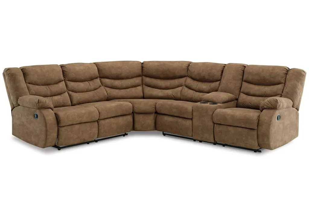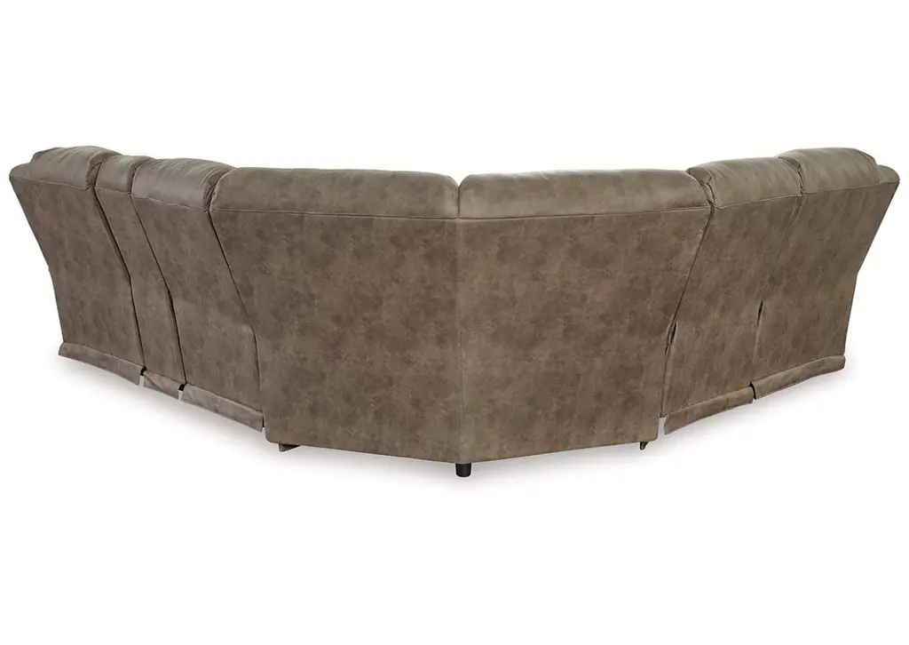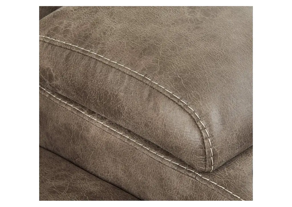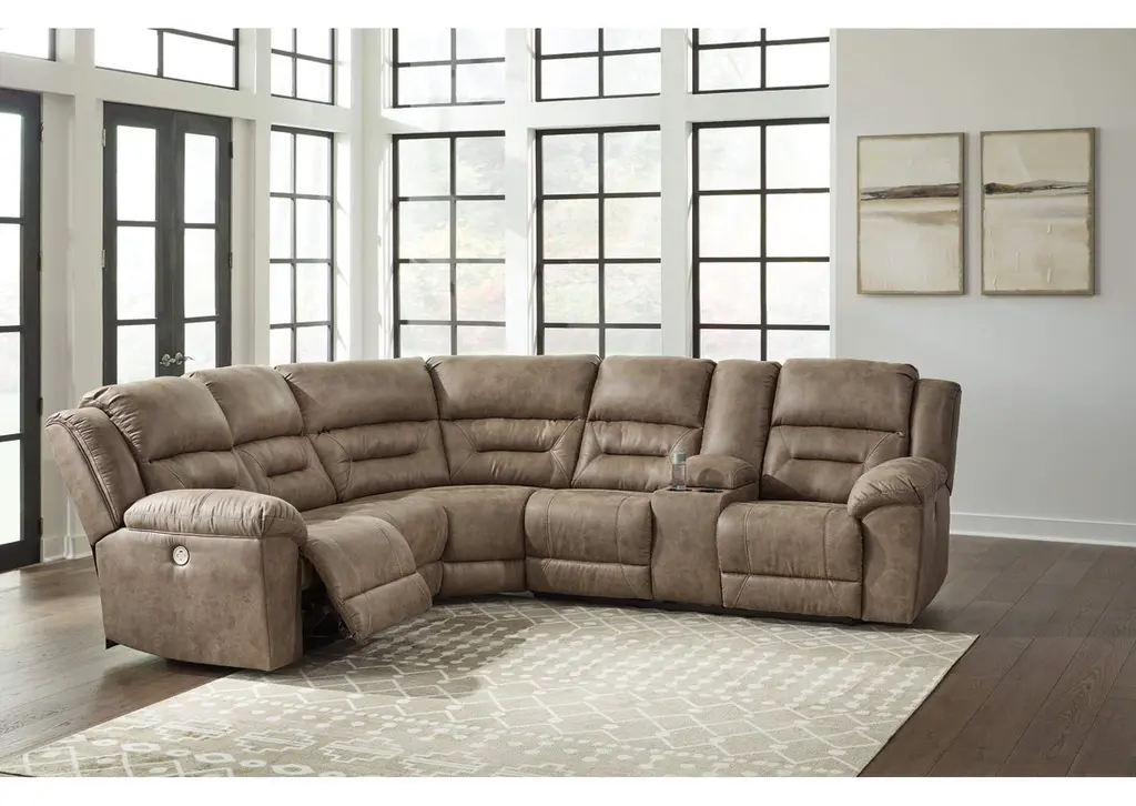 The Ravenel power reclining sectional is designed exclusively for those who are serious about R&R. Its overstuffed cushions and pillow top arms feel oh-so-plush, and the faux leather upholstery accented with jumbo stitching is silky soft. Go from upright to reclined relaxation with just one touch. A clever center console provides storage and keeps drinks at the ready. Weight 444.000 lbs. (199.8kgs.)