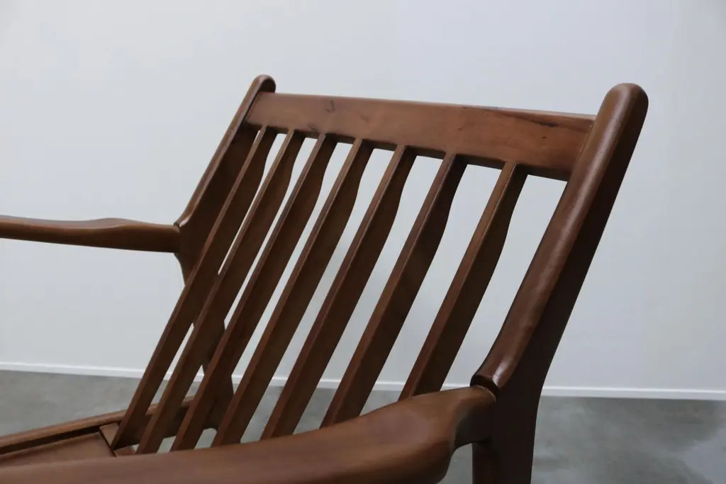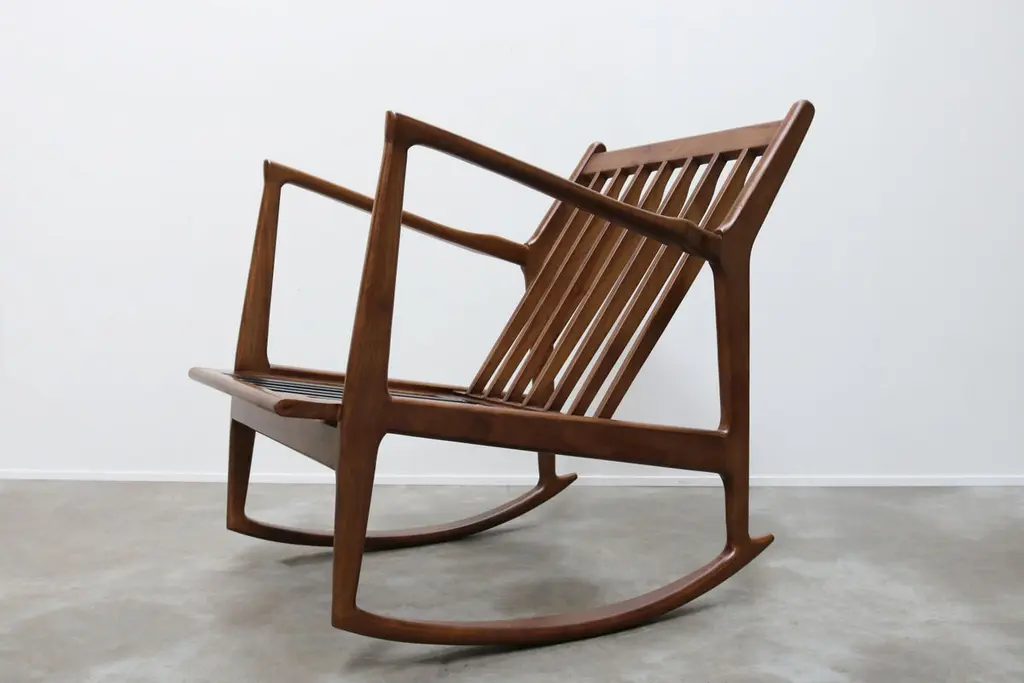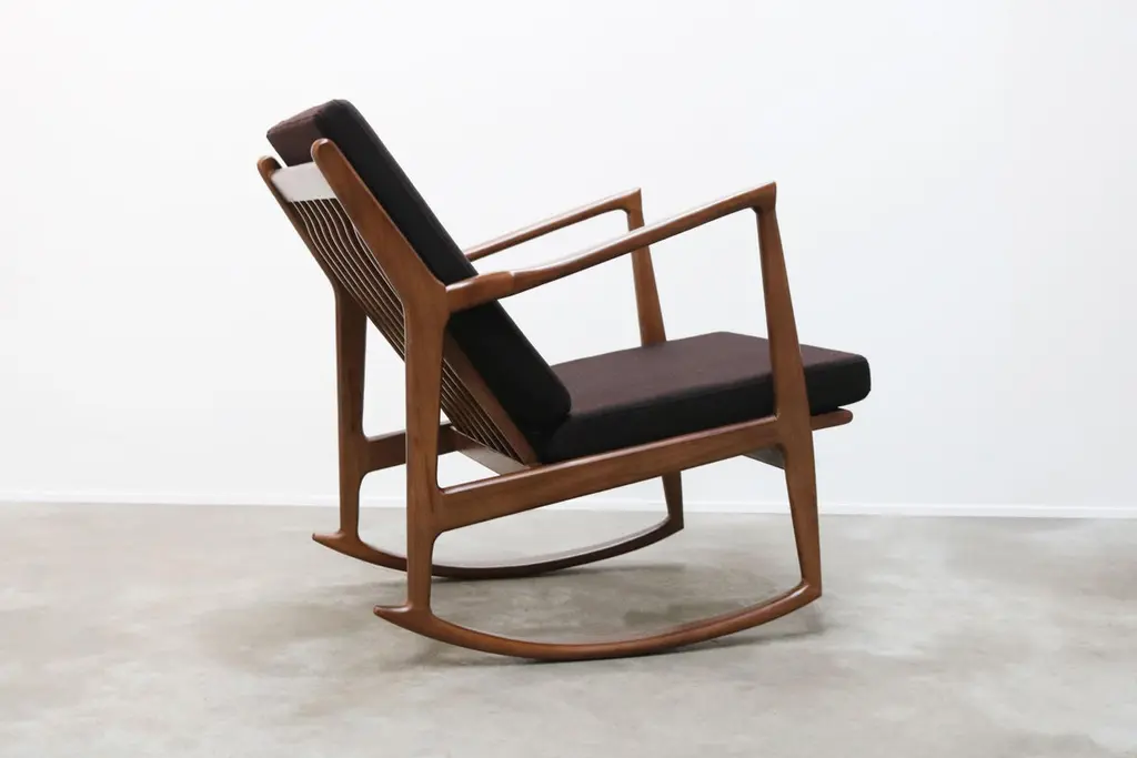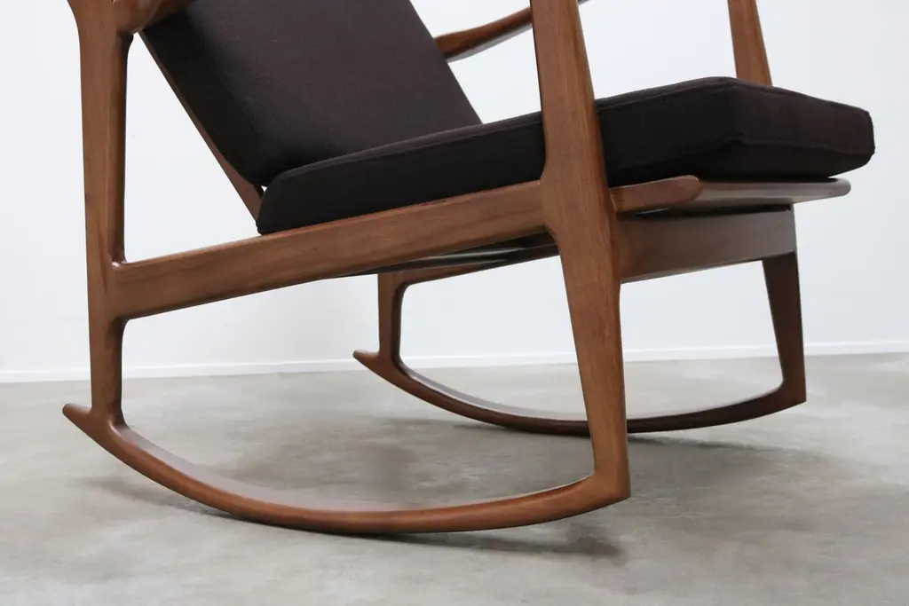 From our own workshop and design collection this gorgeous 1950 danish design style rocking chair.Made out of solid walnut with a brown cashmere upholstery. The rocking chair looks amazing and is most comfortableGreat as a statement piece alone or as a pair.
