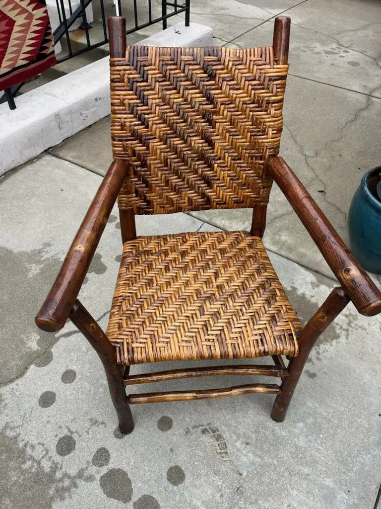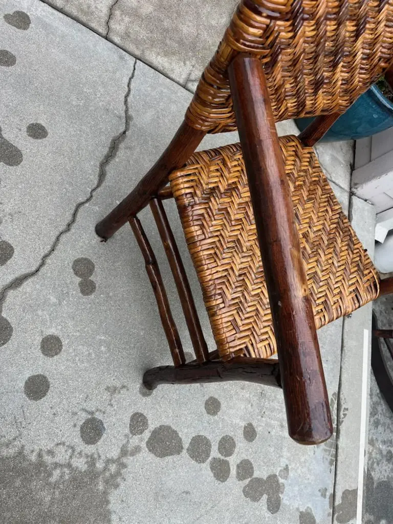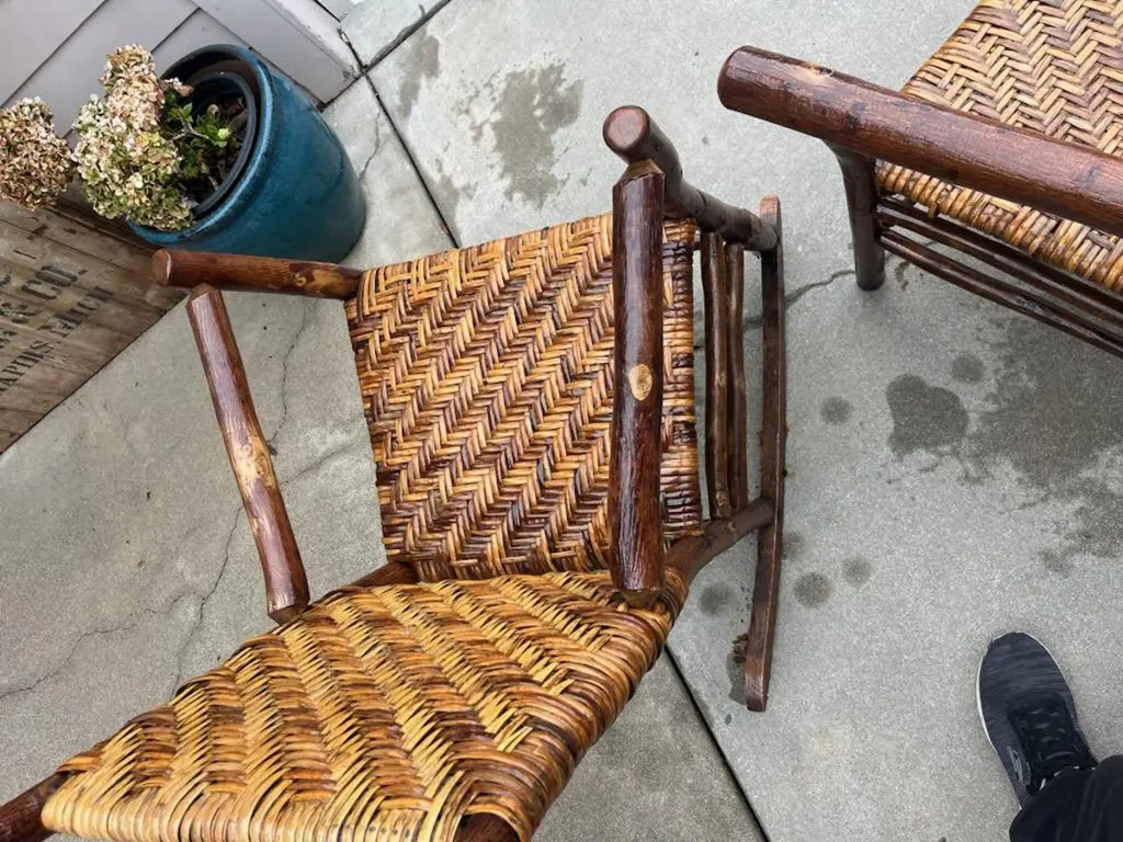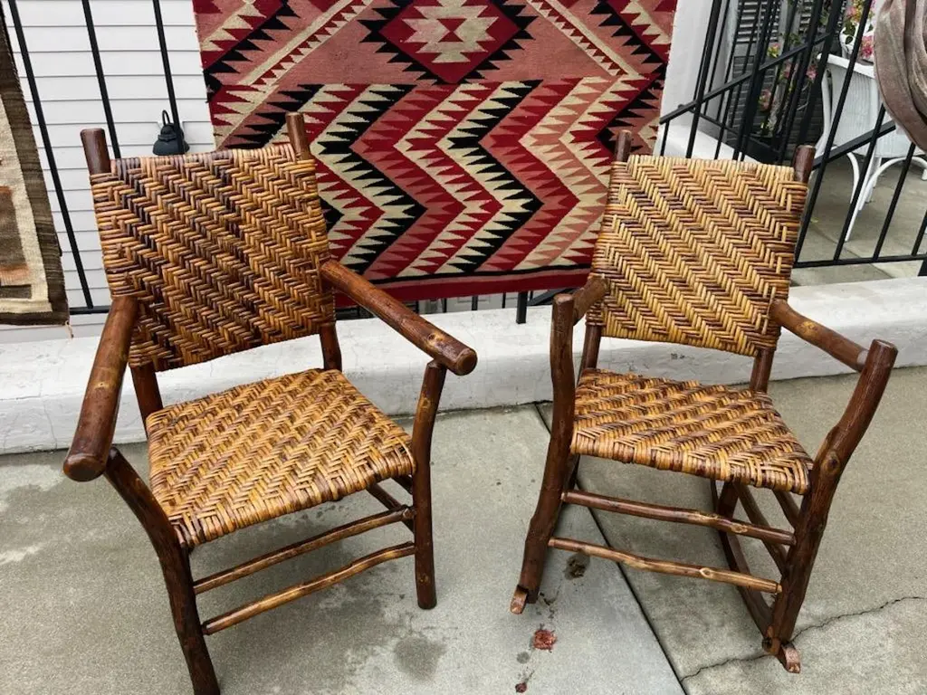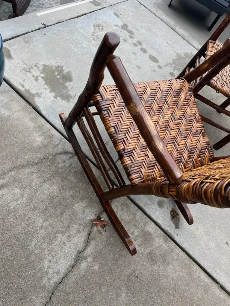 Old Hickory Chair and Rocker with Cane Seating. Great age and patina. Wonderful Design. This set has been coated with marine varnish to add an extra protect-ant/ sealer on the chairs for all weather purpose and to be used outdoors if necessary. Hickory chair measures - 26wide x 38 high x 23 deep x 17 seat heightHickory Rocker measures- 24 wide x 38 high x 30 deep x 18 seat heightIf individually purchased - $1775 individually