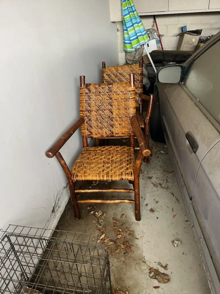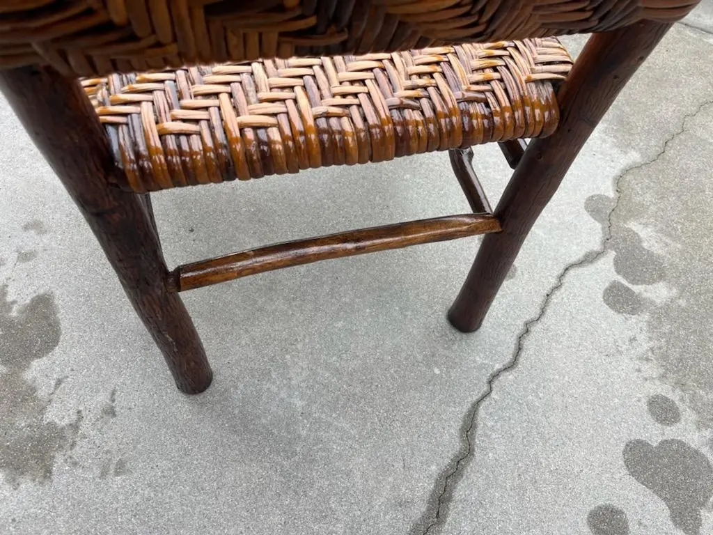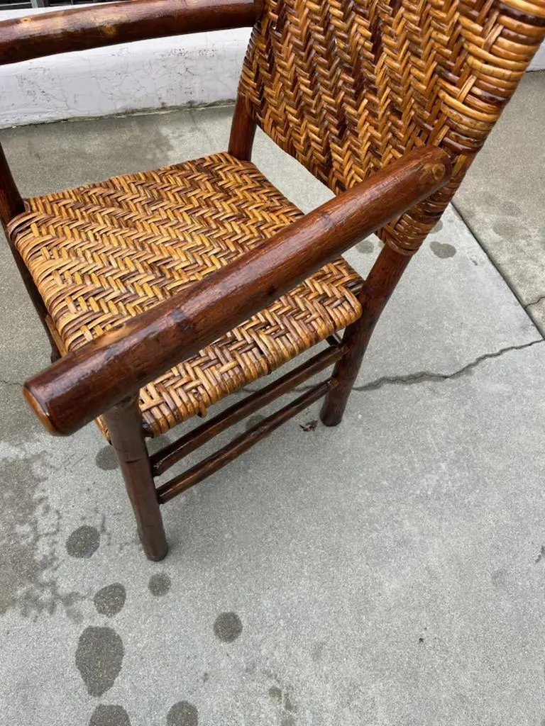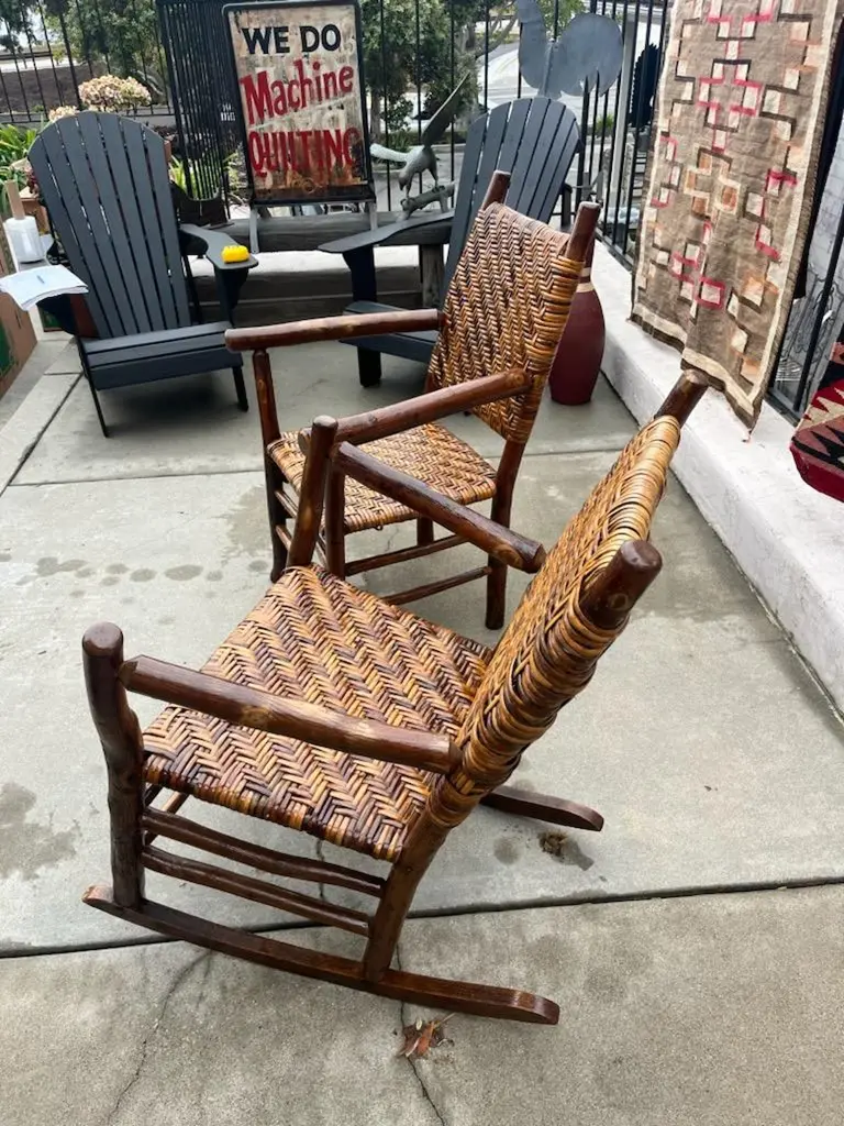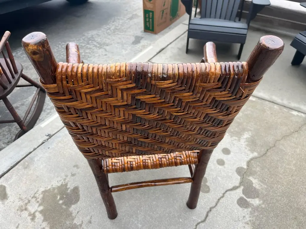 Old Hickory Chair and Rocker with Cane Seating. Great age and patina. Wonderful Design. This set has been coated with marine varnish to add an extra protect-ant/ sealer on the chairs for all weather purpose and to be used outdoors if necessary. Hickory chair measures - 26wide x 38 high x 23 deep x 17 seat heightHickory Rocker measures- 24 wide x 38 high x 30 deep x 18 seat heightIf individually purchased - $1775 individually