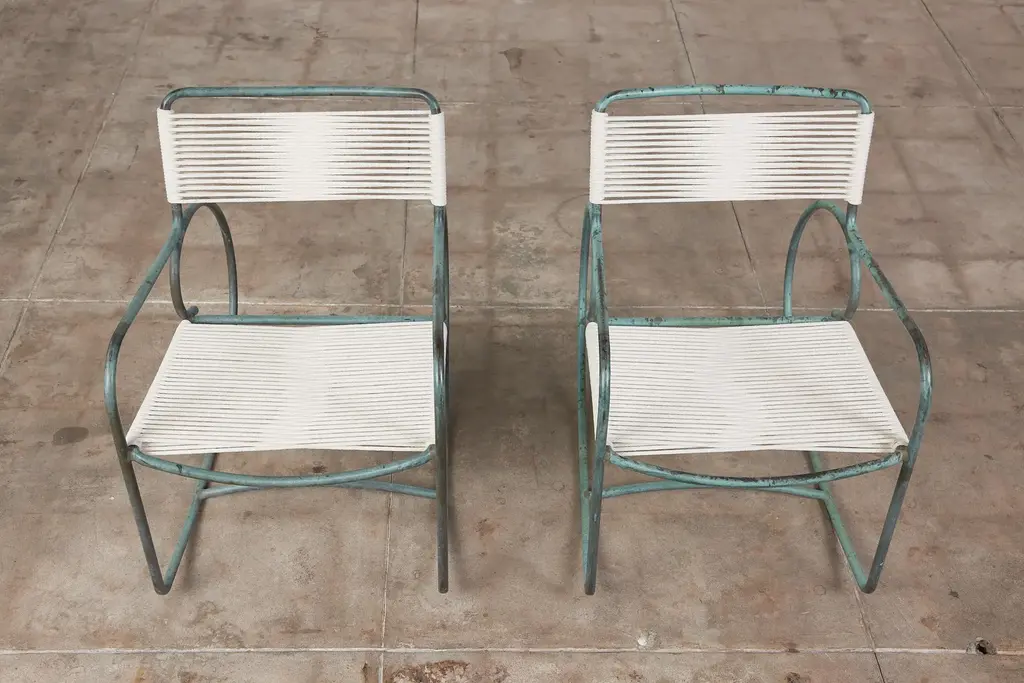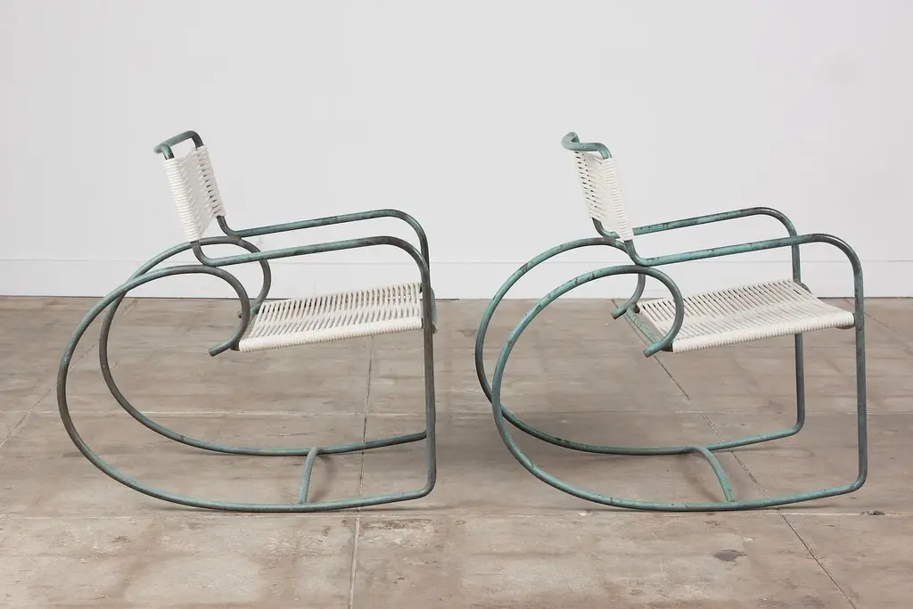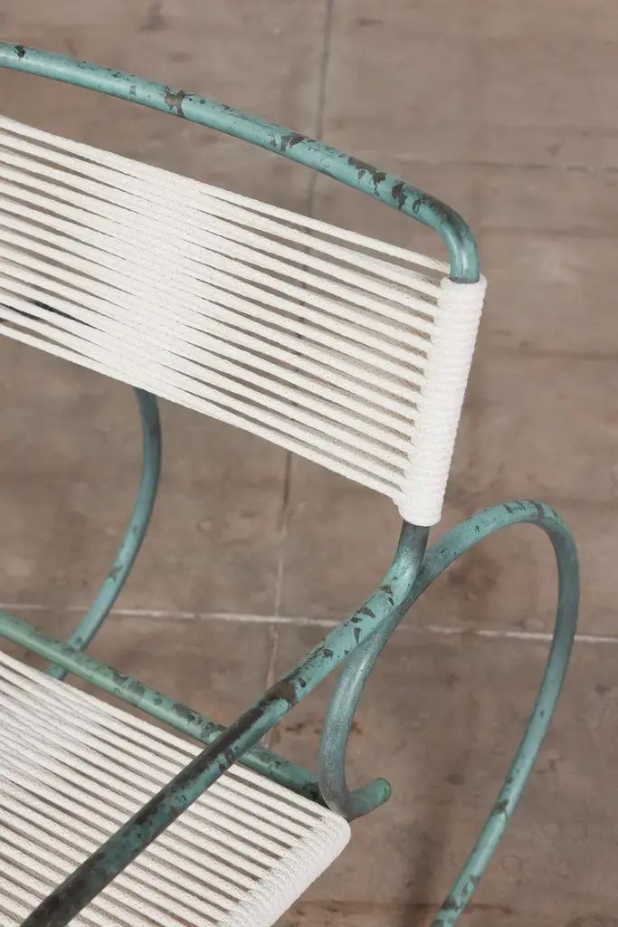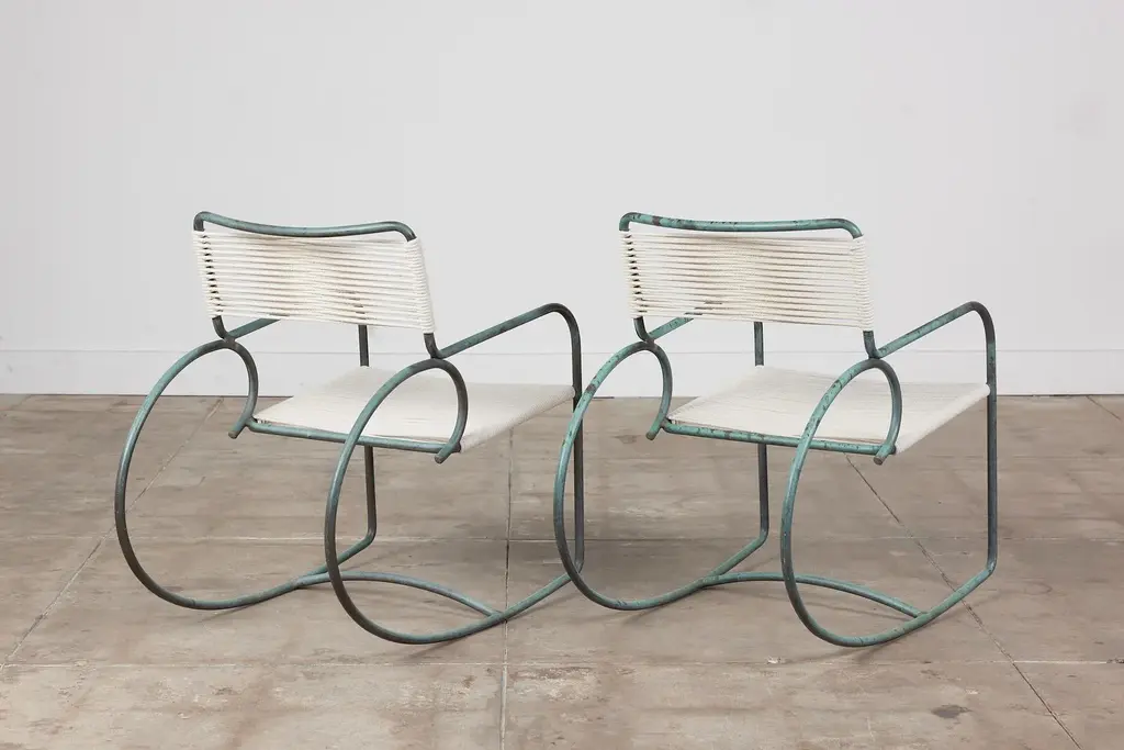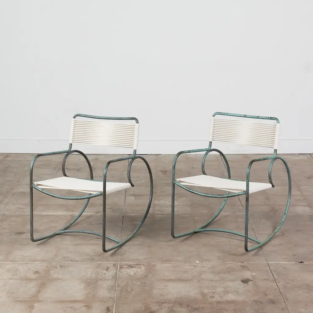 A bronze rocking chair designed by Walter Lamb and produced by Brown Jordan. The chair has a sculptural shape, with a single formation of tubular bronze forming the backrest, arms, exaggerated round runners, with a stylistic curlicue at each end. The back and seat are strung with cotton rope, lightly glazed to render it suitable for outdoor use. All Walter Lamb patio furniture at DEN has been restored with the utmost attention to the designer’s original specifications. We rope all seating with a polished cotton sail cord that closely approximates what would have been offered by Brown Jordan when the line was originally retailed. While the cord will retain its shape and strength in most US climate zones, please expect to see some changes in color and texture over time due to weathering and natural accumulation of particulate matter.To maintain showroom condition, we advise covering your furniture when not in use, and especially during extreme conditions. Seating can be re-roped in a synthetic cord more resistant to discoloration; we strongly recommend this option for humid climates. This piece does not retain original labels. Dimensions: 20.75” width x 33” depth x 32” height; seat height 16” Condition: Excellent restored condition; The bronze carries an age-appropriate patina and the seat has been re-strung with yacht cord according to the original design.