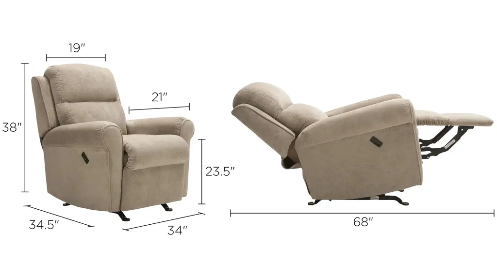 A great way to watch TV or complete your living room conversation area, this Adele power rocker recliner offers the perfect spot to unwind. Choose from infinite reclining positions at the touch of a button while you enjoy the full-length support of the chaise leg rest. For a beautiful finishing touch, this petite rocker recliner features elegant welting and lightly pleated arms for a neatly tailored look.