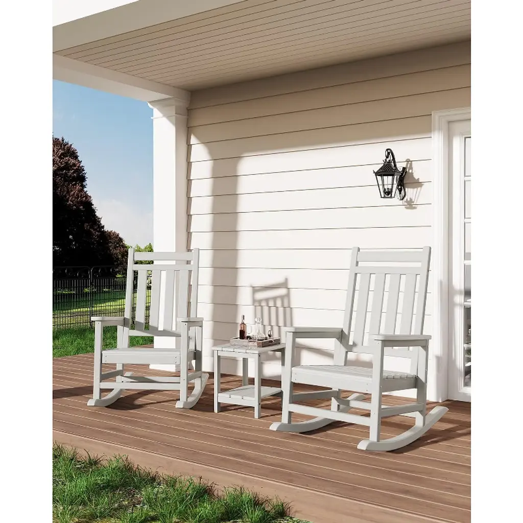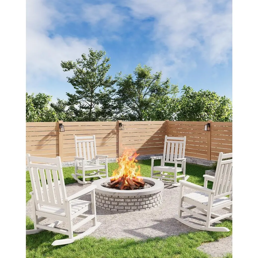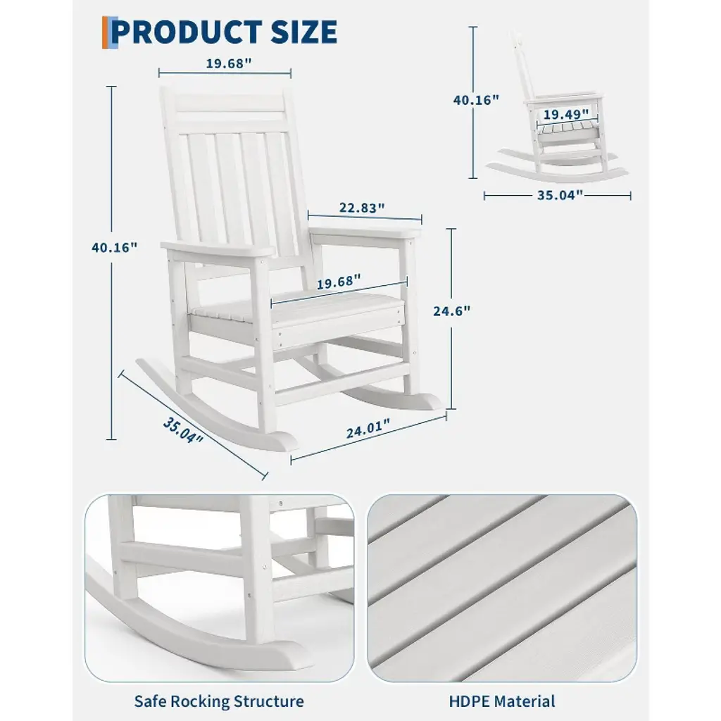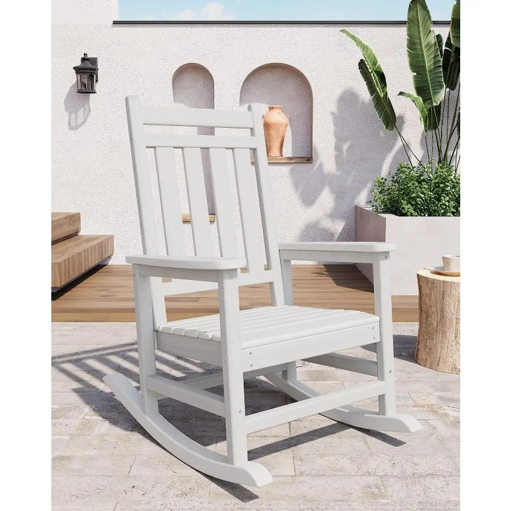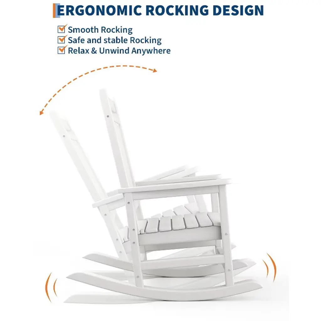 Enjoy the perfect blend of comfort and durability with this Adirondack Outdoor Rocking Chair. Crafted from all-weather HDPE, it resists fading, cracking, and peeling for year-round use. The wide armrests, slatted back, and rocking base provide ultimate relaxation, while its 380 lb weight capacity ensures stability. Low-maintenance and easy to assemble, it’s ideal for patios, porches, fire pits, or gardens.
