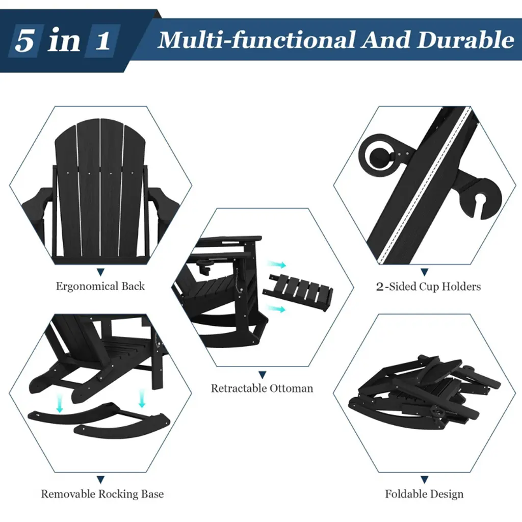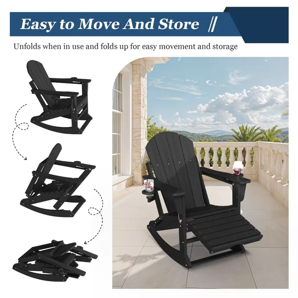 Adirondack Rocking Chair With Retractable Ottoman And Cup Holder, All Weather Hdpe Folding Adirondack Chair,fire Pit Chair For Porches, Patios