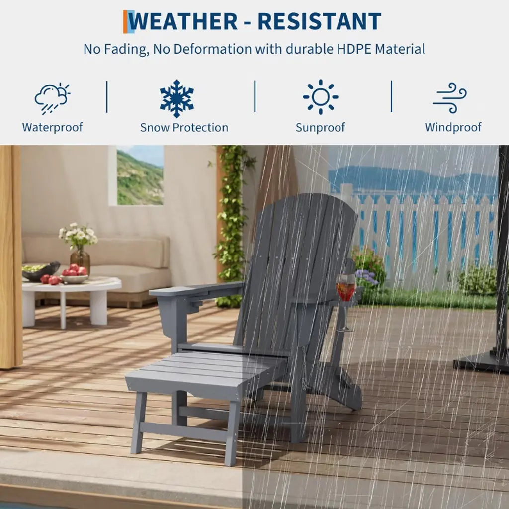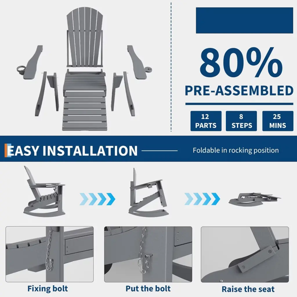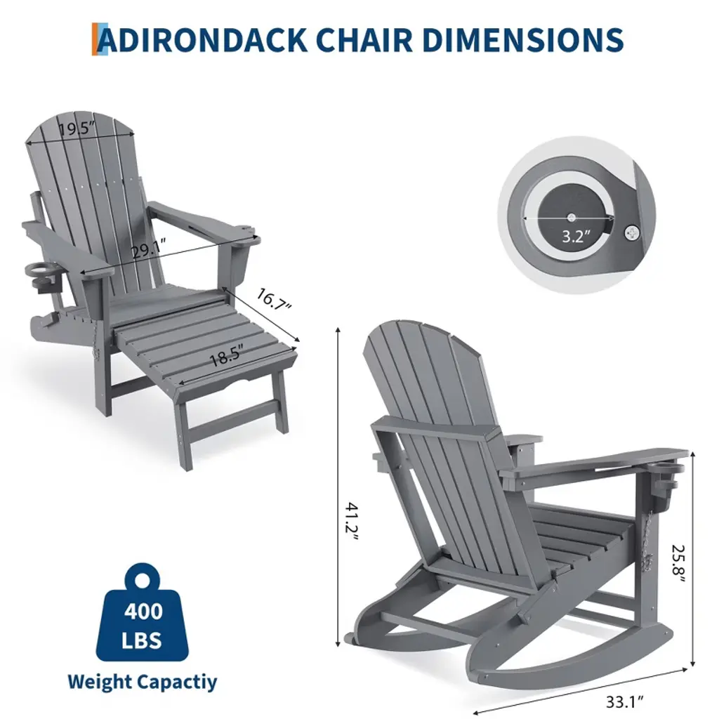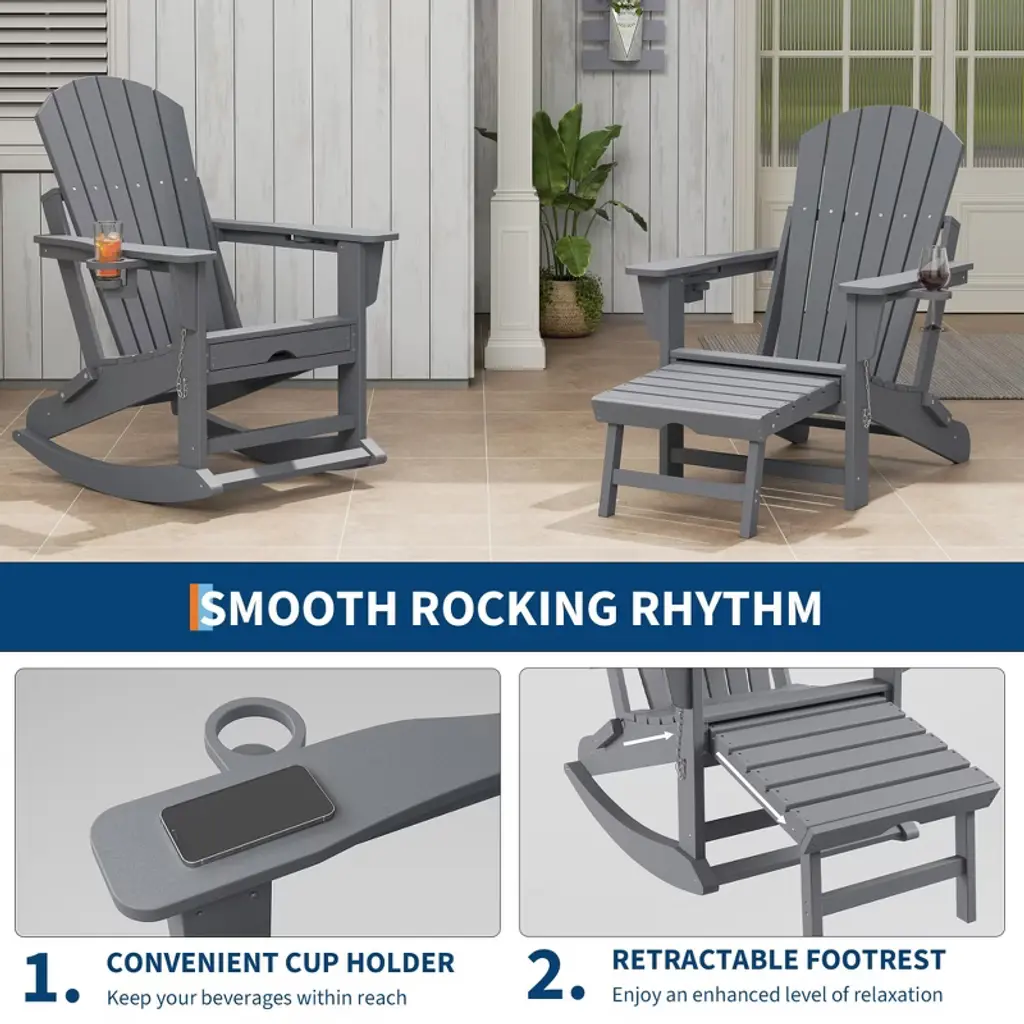 Adirondack Rocking Chair With Retractable Ottoman – Folding Outdoor Rocker Chair, Heavy Duty Hdpe Material, Gray (380lb Capacity)
