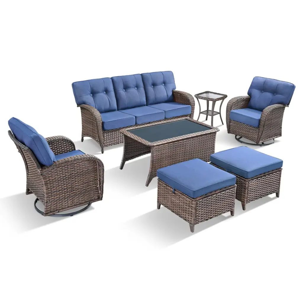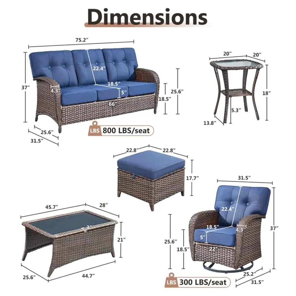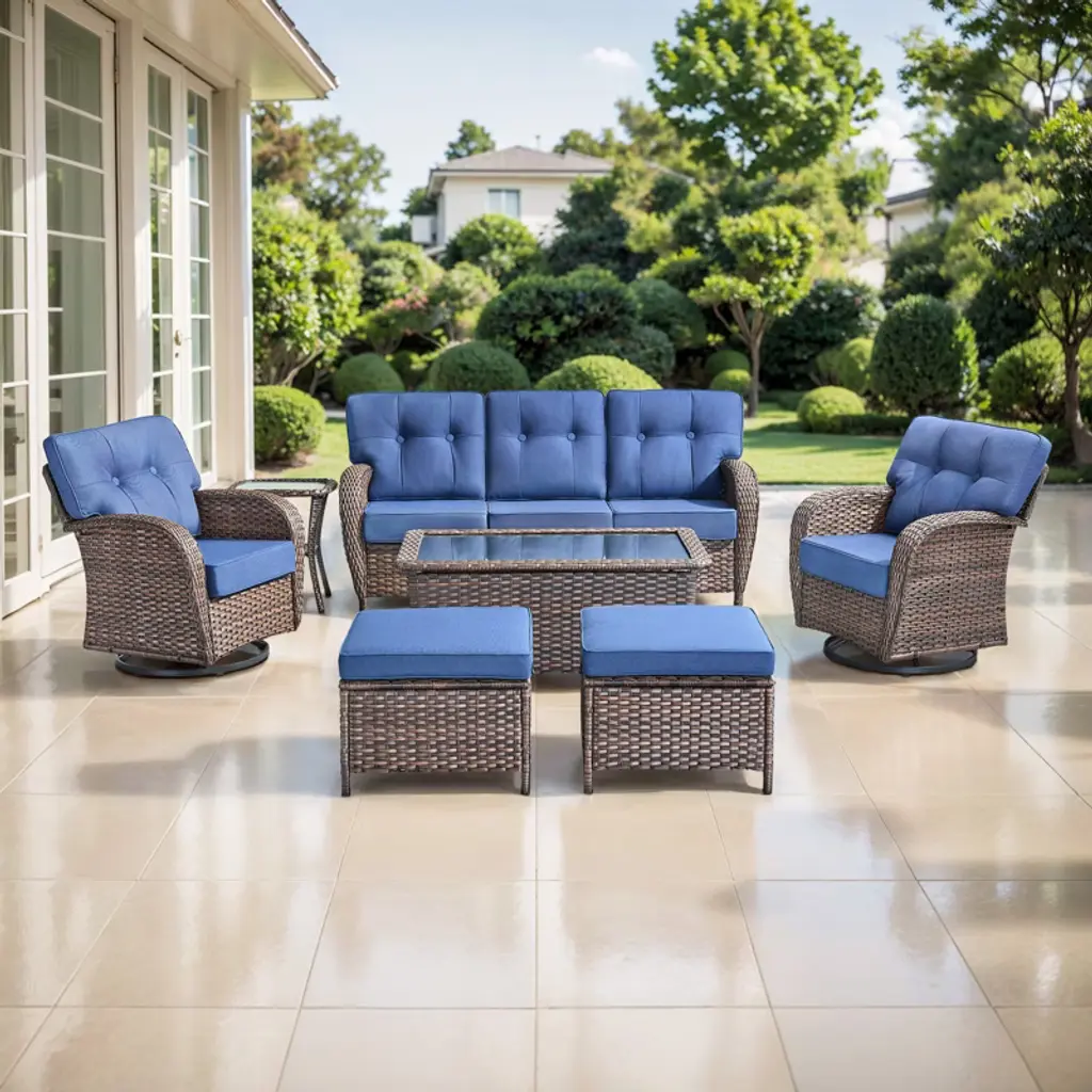 Upgrade your outdoor living with this luxurious 7 Pieces Patio Lounge Set featuring Swivel Chairs & Multi-Functional Ottomans, designed for ultimate comfort and versatility. The outdoor conversation set¡¯s centerpiece includes plush swivel chairs crafted from durable brown PE wicker with rust-proof powder-coated steel frames, 5"-thick 100% olefin cushions, and extra-wide 31.5" backrests for superior relaxation¡ªplus effortless 360¡ã rotation to follow the sun or conversation. Two heavy-duty ottomans (250lb capacity each) serve as footrests or extra seating, while a spacious coffee table and a two-tier side table, both with tempered glass tops on matching steel frames, provide ample space for drinks, snacks, and decor. Built to endure the elements, the set boasts fade-resistant wicker, weatherproof fabrics, and reinforced glass construction, making it perfect for patios, balconies, or poolside lounging. Combining timeless design, exceptional durability, and enhanced functionality with the added coffee table, this ensemble transforms any space into a stylish outdoor retreat.