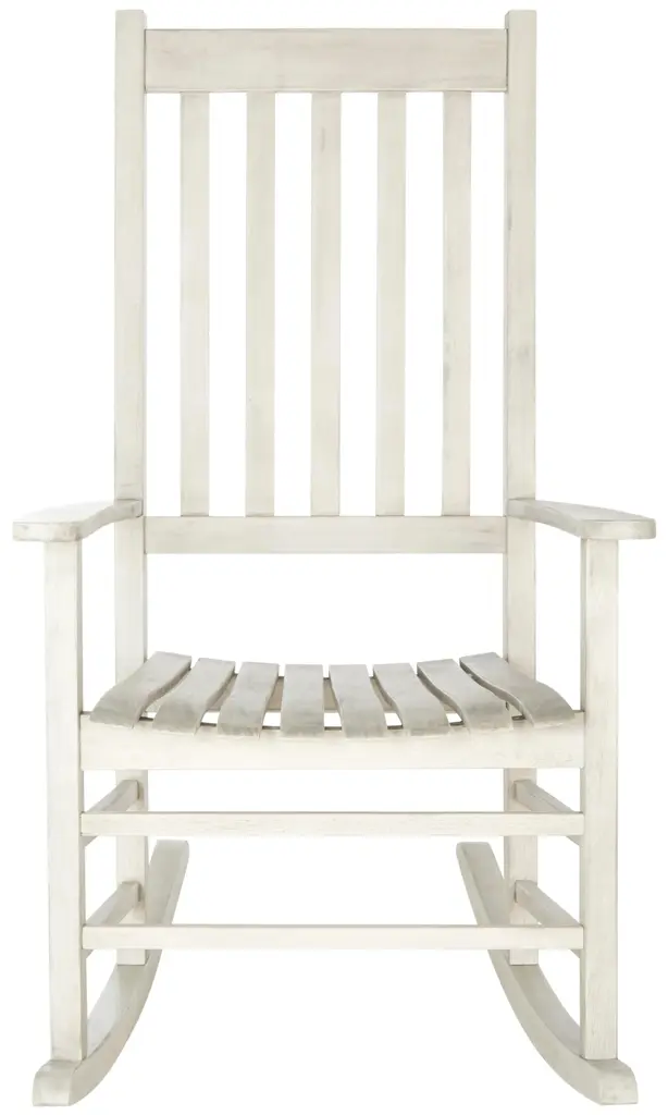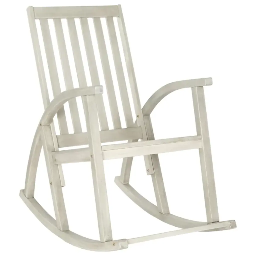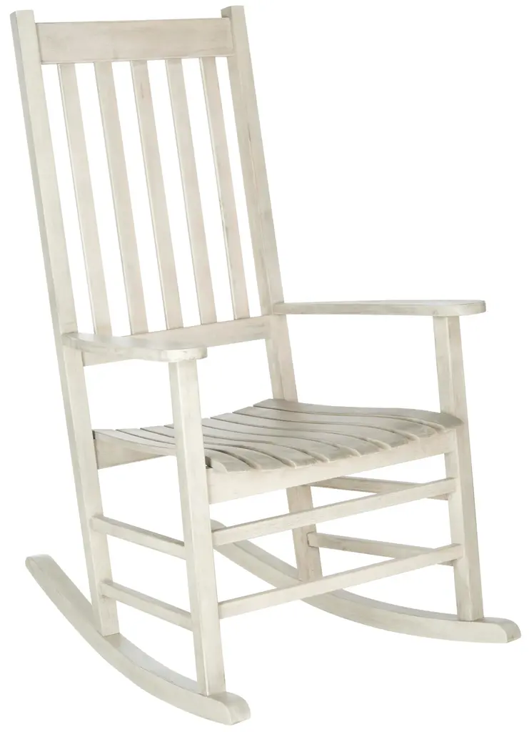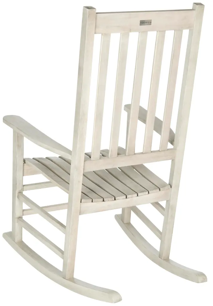 A country porch classic, the char Shasta rocking chair is a perennial favorite in homes across America. Meticulously crafted of sustainable acacia wood with a whitewash finish, this piece is designed for comfort, long wear and ease of care. Store outdoor furniture indoors or cover well when not in use. Remove wooden furniture from standing water. Dust regularly with small brush or vacuum. Spills should be taken care of immediately before they harden or stain with a slightly dampened sponge. Do not use bleach solutions. Some assembly required.