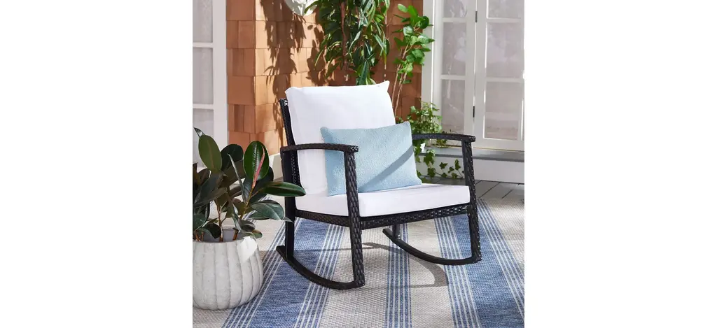 Classic meets contemporary in the sophisticated Bradbury rocking chair. Bradbury's open frame in black PE rattan emanates a soothing breezy look, while plush weather-strong cushions make for luxury that lasts.