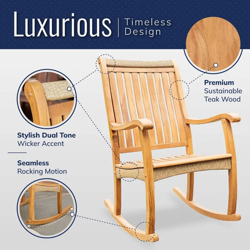 Transform your porch with the addition of a stunning outdoor rocker from Cambridge Casual - the Willow Teak Outdoor Rocking Chair. This exquisite piece combines the rustic charm of natural, unfinished wood with the elegance of honey twist wicker. Crafted from high-quality Indonesian teak wood, renowned for its strength and longevity, this Cambridge casual outdoor rocking chair is built to last. The gracefully curved backrest and seat provide optimal support for your spine and body, ensuring ultimate comfort. Furthermore, the flowing lines of the design elevate its aesthetic appeal.
