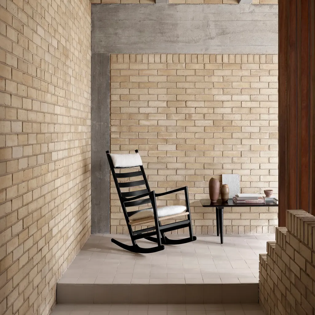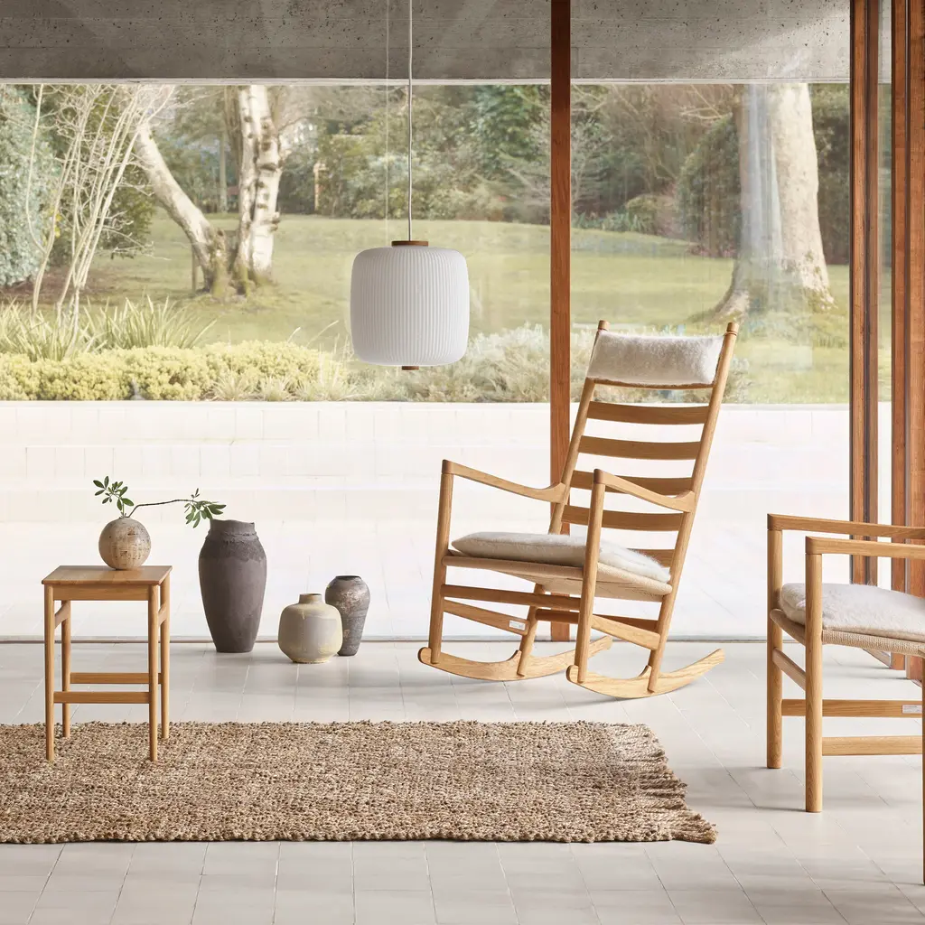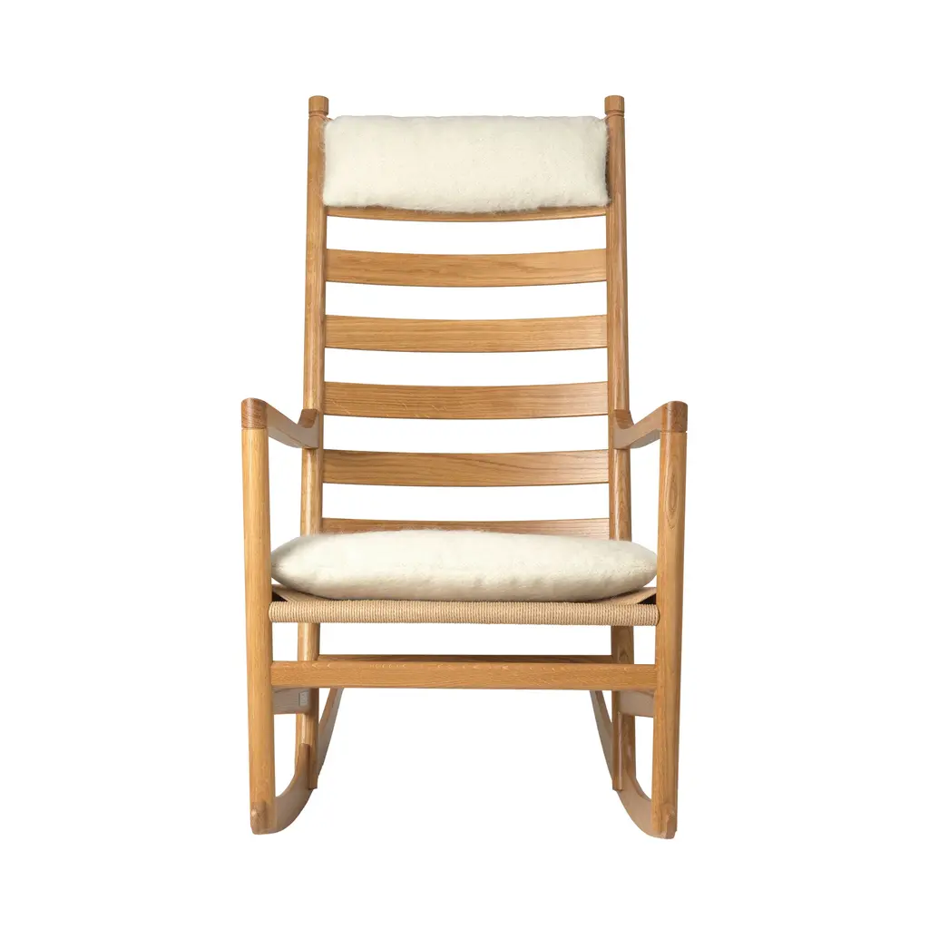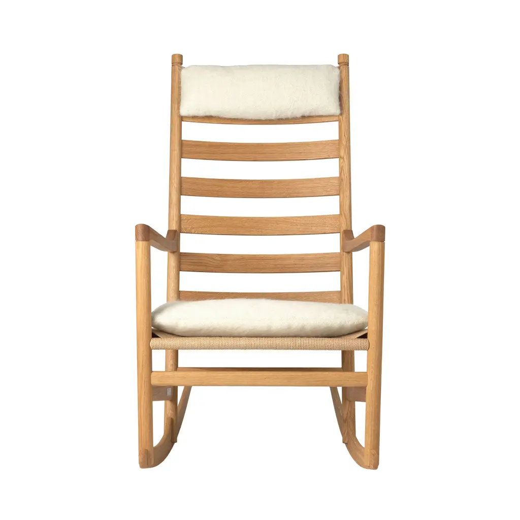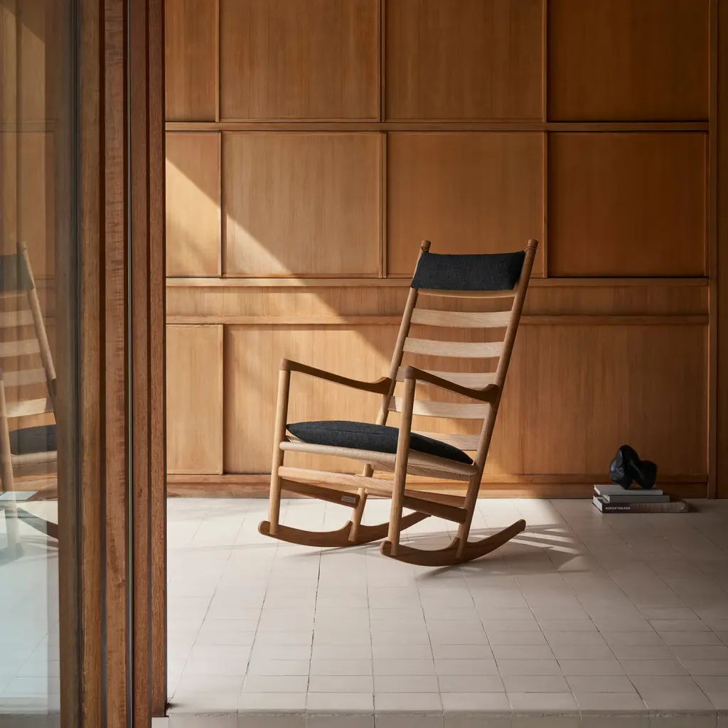 The addition of a soft cushion for the headrest and another one atop the woven seat ups the comfort level of Hans J. Wegner’s highback rocking chair. Flawlessly crafted in FSC-certified oak, CH45 is a design stalwart dating from the mid-1960s that embodies a simple ethos and enduring relevance inspired by Shaker furniture designs.