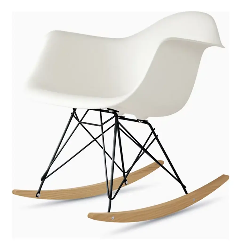 Originally designed by Charles and Ray Eames in 1950, the Eames® Molded Plastic Armchair – Rocker Base by Herman Miller brings a modern edge to any room. The recyclable polypropylene shell has a soft matte texture with a distinct metal base in Trivalent Chrome, White or Black attaching to runners of Ebony, Natural Maple, Walnut or White Ash. This comfortable piece comes in an array of contemporary colors.