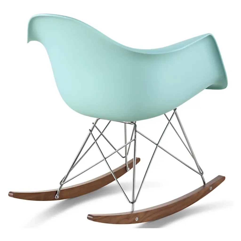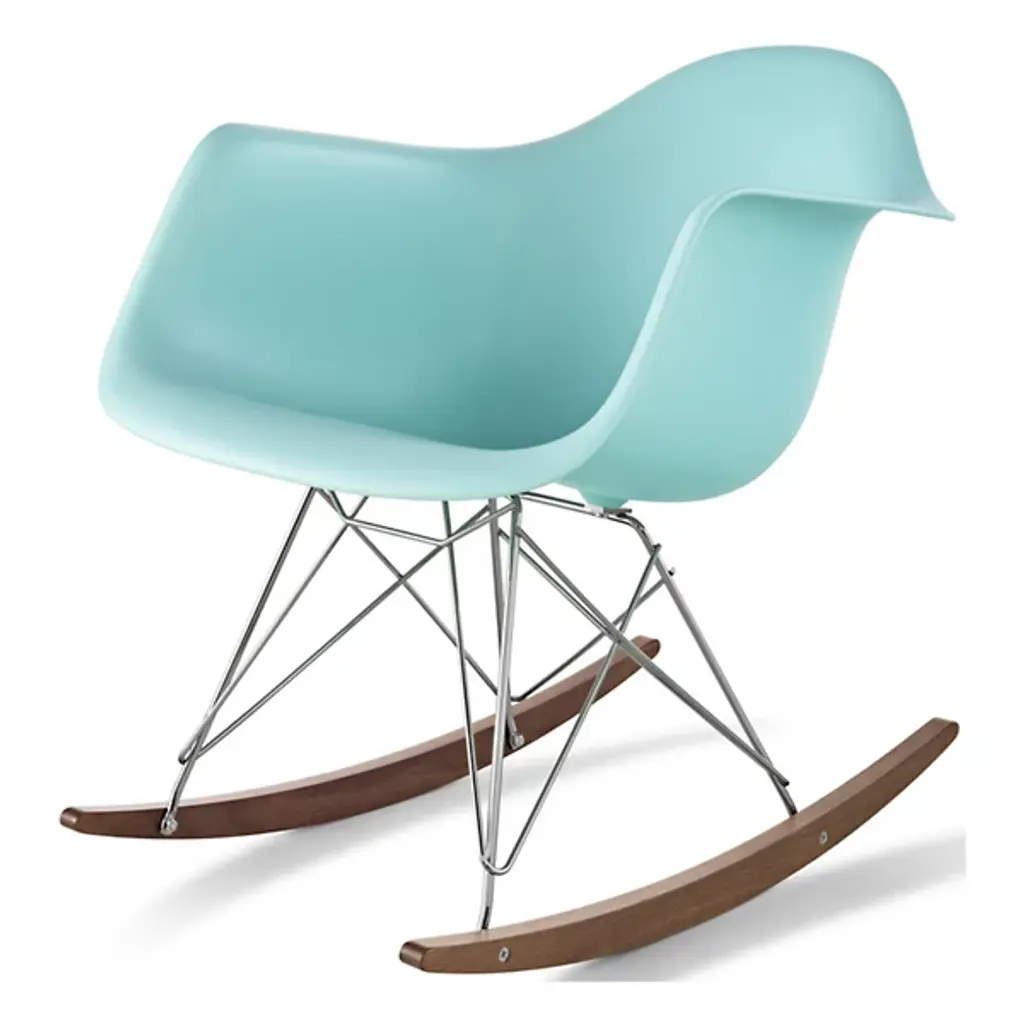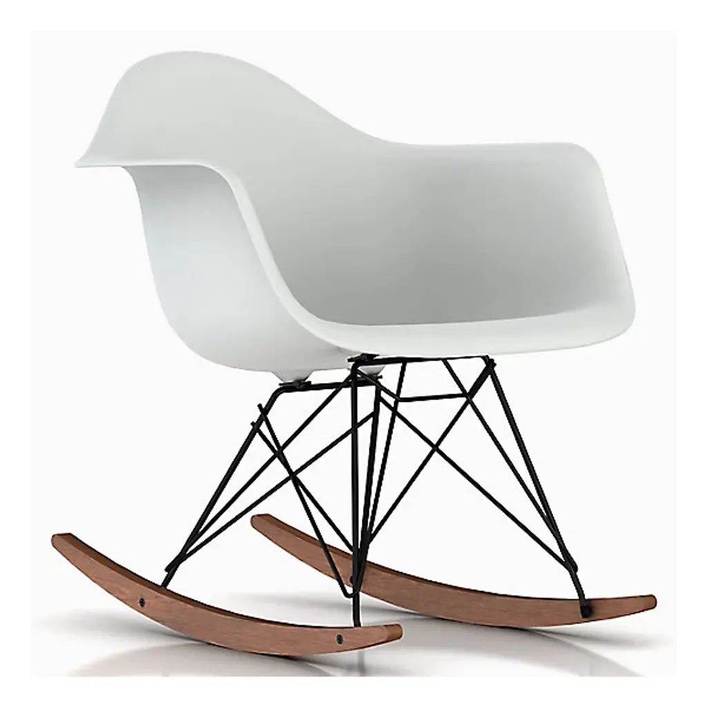 Originally designed by Charles and Ray Eames in 1950, the Eames® Molded Plastic Armchair – Rocker Base by Herman Miller brings a modern edge to any room. The recyclable polypropylene shell has a soft matte texture with a distinct metal base in Trivalent Chrome, White or Black attaching to runners of Ebony, Natural Maple, Walnut or White Ash. This comfortable piece comes in an array of contemporary colors.