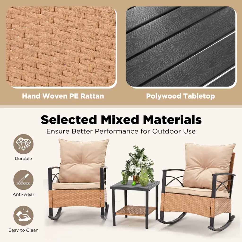Erommy 3-piece Bistro Set,outdoor Pe Rattan Rocking Chairs With Cushions And Coffee Table,patio Rocker Chair Set For Porch And Backyard,beige