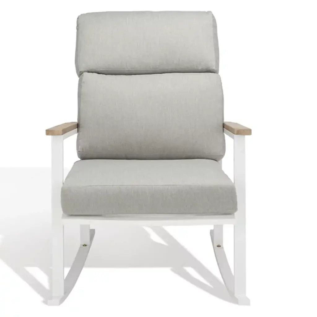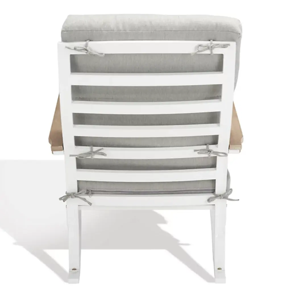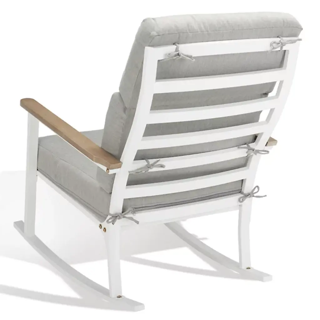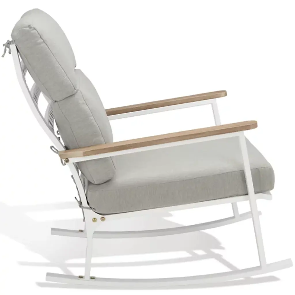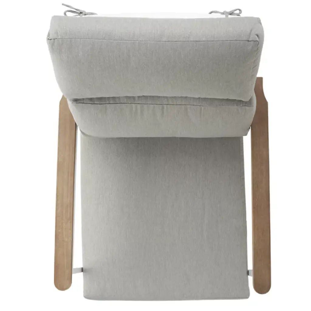 The Fawley Outdoor Rocking Chair from Alder & Ore introduces gentle motion to outdoor relaxation. Metal runners provide smooth, balanced movement, while eucalyptus wood armrests add natural warmth to the design. The engineered angle of the backrest delivers optimal support whether you're reading, napping, or watching the sunset. Olefin linen cushions resist fading and maintain their shape, while the chair's proportions accommodate various sitting positions. This modern take on a classic rocker brings peaceful motion to porches, patios, and garden nooks.