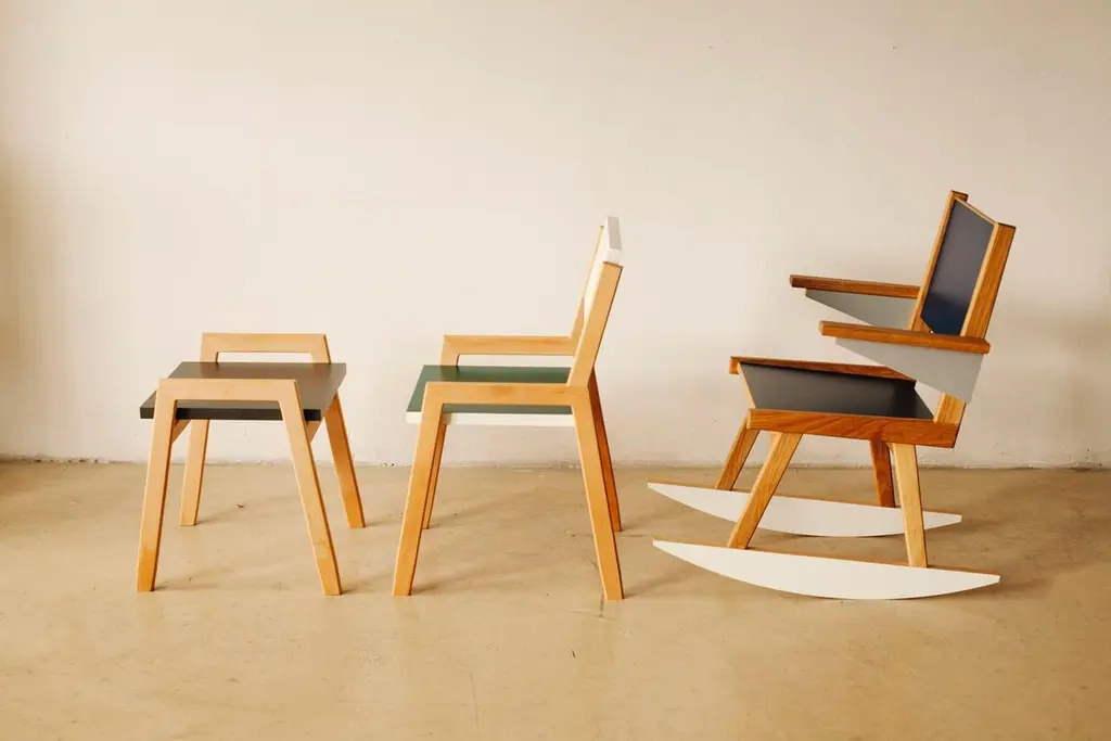 Formica rocker by OwlDimensions: H 85 x W 60 x D 80 cm Seat H: 45 cmMaterials: Solid wood, colourful formicaFormica is a series in which material defines form. The collection combines solid wood with colourful Formica, creating a furniture series that is open to variations and interpretation, while maintaining a linear principle thatunifies the series in a natural manner.All products are customizableEach of our designs is handmade in our workshop, using high-quality materials from local suppliers.OWL is a design studio based in Barcelona that designs and produces unique furniture and objects, mainly but not exclusively in wood, adaptable and scalable to meet the needs of each client, whether private or professional.Our designs are hand built in-house using high-quality materials from local suppliers. A practice that not only allows us to be conscious and sustainable, but also to create objects that stand the test of time. Additionally allowing us to offer a customization service that covers special and large-scale projects.