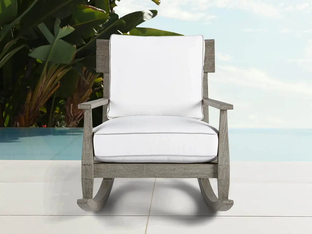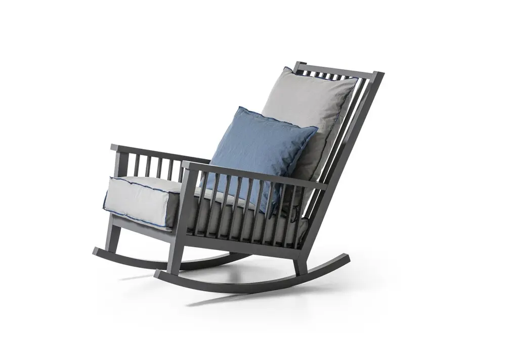 Rocking chair in wood, Gray 09 is characterised by a high backrest with visible slats on which a soft loose cushion rests. The structure, with a large and welcoming seat, is made of natural painted Canaletto walnut, bleached oak or white, grey, black, ocean or dove-grey lacquered oak.Rocking-chair, frame in walnut or oak. Available wood finishes: natural lacquered American walnut; bleached oak; white, grey, air force blue, black lacquered oak. Loose cushions: one 65 x 80, one 65 x 50 cm.Additional Information:Material: Upholstery, foam, woodFrame finish: Grey lacquered oakUpholstery: Fog Cat. D (6375)Dimension: 76 W x 106 D x 110 H cmSeat height: 38 cmArmrest height: 57 cmAvailable in other frame finish options: Natural lacquered american walnut, bleached oak, white lacquered oak, air force blue lacquered oak, black lacquered oakAvailable in other upholstery options: Cat. I, Cat. H, Cat. B, Cat. C, Cat. E