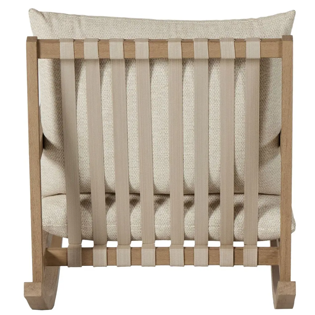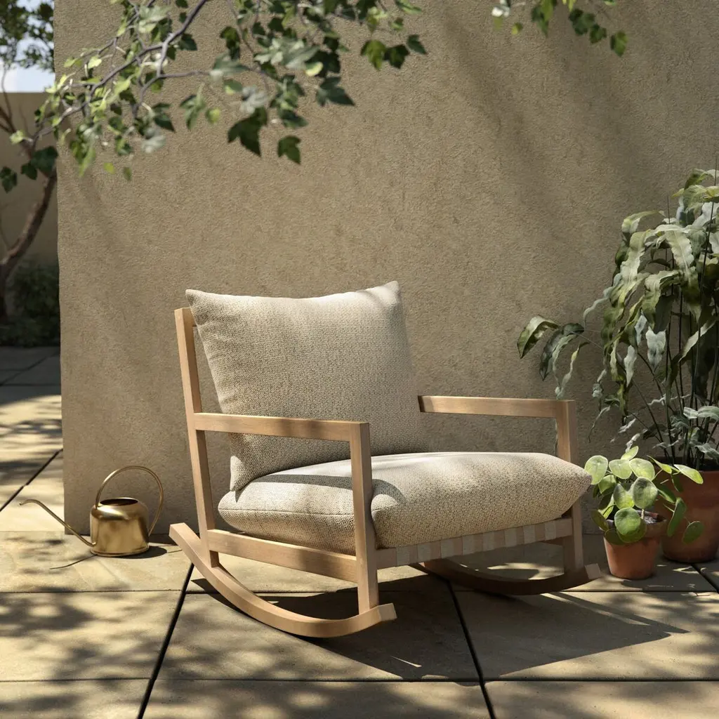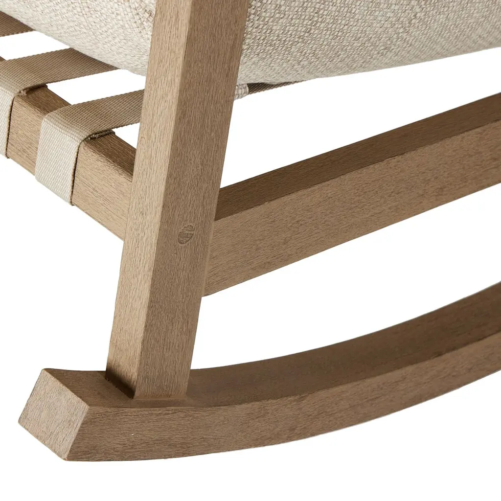 With its clean lines and neutral tones, this rocker fits right in with just about any style of porch, patio, or sunroom. The frame is made of durable FSC-certified teak, a hardwood resistant to both moisture and termites; the cushions are clad in equally durable olefin, which resists stains, moisture, and fading.